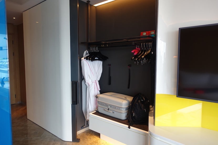 To the left of the mini bar and television was a closet with a gigantic sliding door. If the door were open, the light was on, even if your master switch were turned off, so I had to close it to sleep. It had a shelf, hanger space and a couple drawers, including one with the room safe.