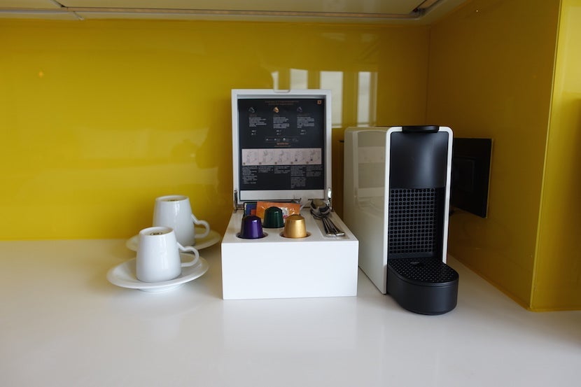 This whole side of the room was paneled in white and yellow with a 48-inch television mounted on the wall. There was a bar shelf with booze and glasses, and below that, a Nespresso coffee set.