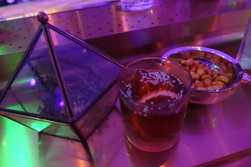 I chose one of the signature drinks, a sesame oil-washed Negroni with gin and Campari. It was not cheap at 128 CNY ($19), but it was made in front of me and served in a glass case with smoldering herbs to infuse it with extra flavor. It was delicious.