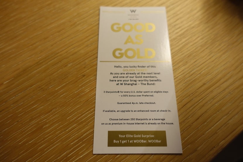 One final consideration for booking the W — other than the cool factor — was that I wanted to maintain Gold status with Starwood Preferred Guest (and automatic Marriott Rewards Gold elite status as well). At the time, I only had six stay credits under my belt, but I needed to hit at least 10 for Gold. Thanks to the Starwood Preferred Guest promotion running during my stay dates, though, I earned double stay credits both for my reservation at the W and my single night at the St. Regis Shanghai. So with two stays counting for four, I knew I would hit that 10-stay mark during my trip and secure Gold status for the following year. And sure enough, the same day I checked into the W, I got an email from Starwood Preferred Guest congratulating me on re-qualifying for Gold.