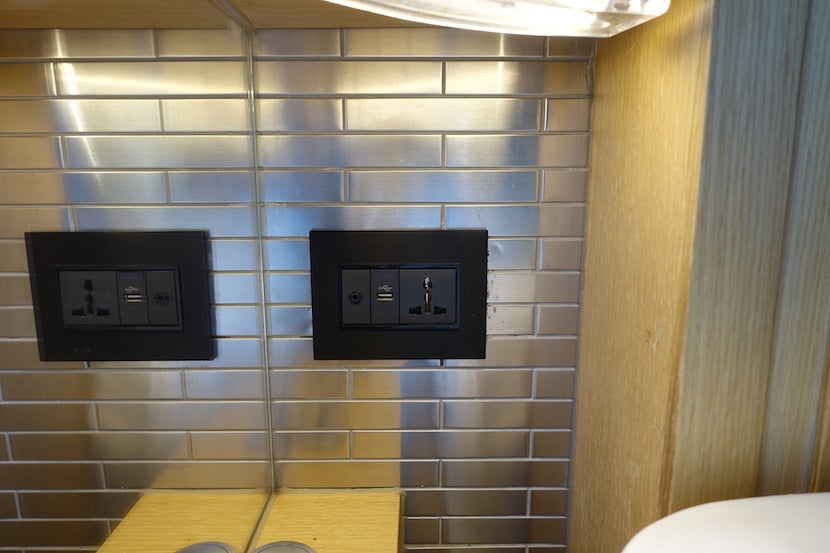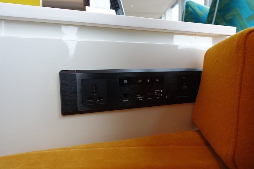 Thanks to the curvature of the building, the windows let in a ton of light, and though my view mainly looked out over the river and neighboring buildings, if I craned my neck from the side of the room farthest from the bed, I could see the skyscrapers of Pudong. There was a set of plugs and A/V inputs here, so it made for a great place to get work done.