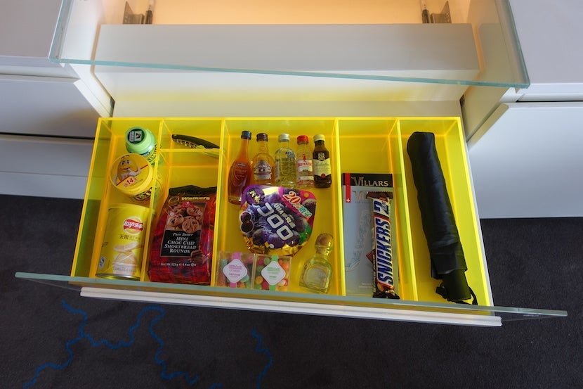 One of the drawers held smaller bottles of liquor and snacks, then below that was a drawer with a kettle and more cups.