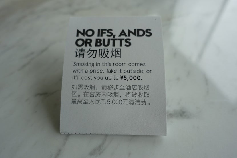 A sign warned guests that smoking would incur a 5,000 CNY ($750) fine, though that did not seem to have deterred a previous guest, judging by the faint smell of smoke.