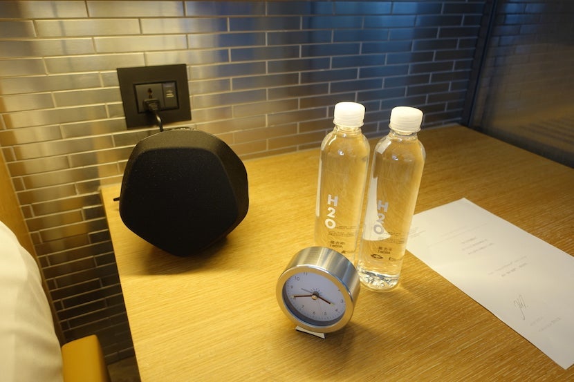On the side closest to the bathroom, the nightstand held a speaker, a clock and two complimentary bottles of water (though after I left a note for housekeeping asking for more, they stocked my room with six). This side also had a large lamp mounted in the headboard. There was a socket with a plug and a USB port.