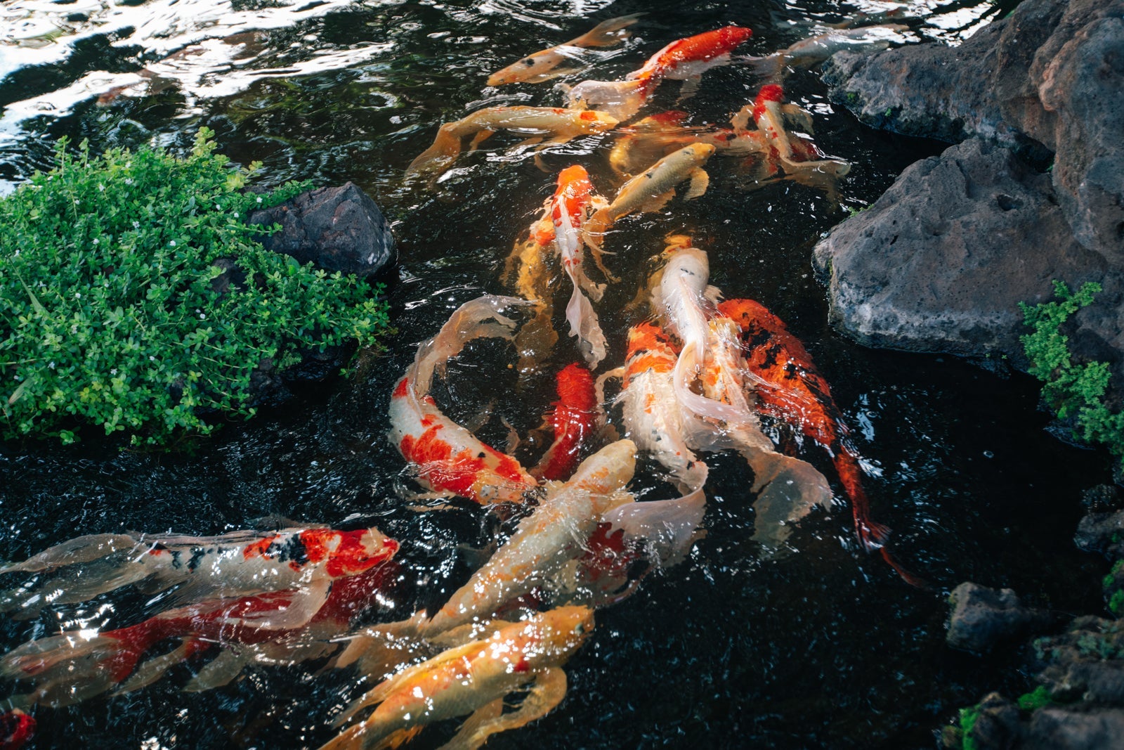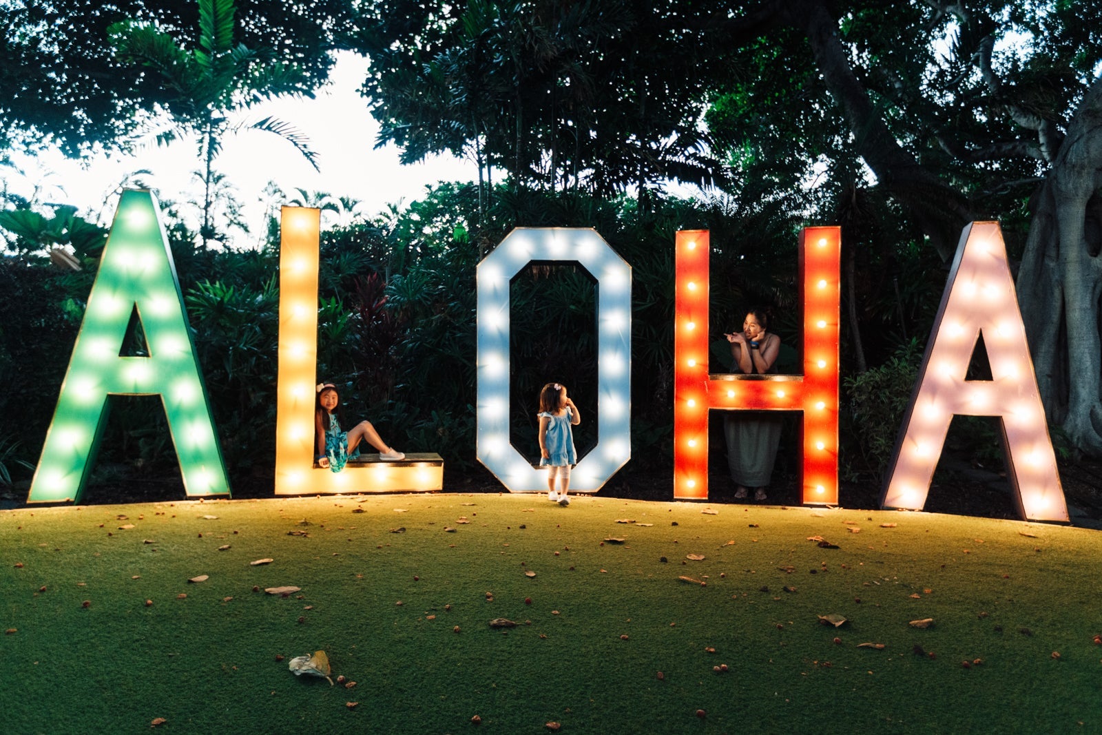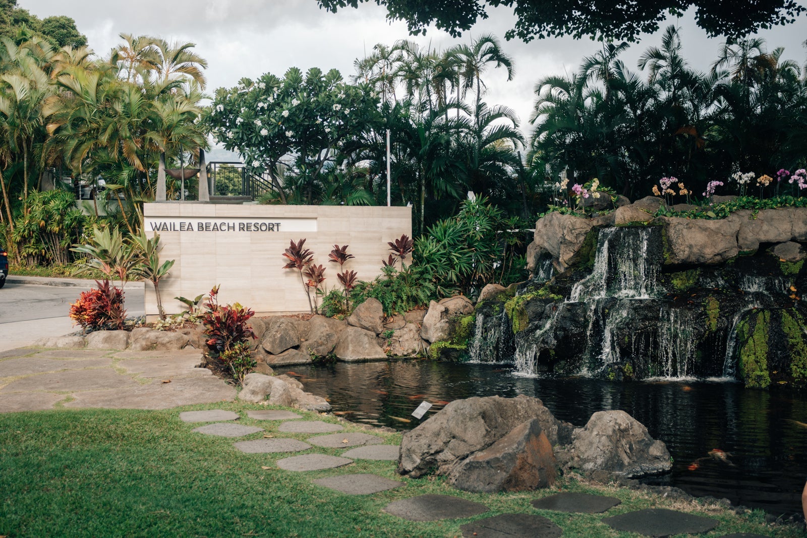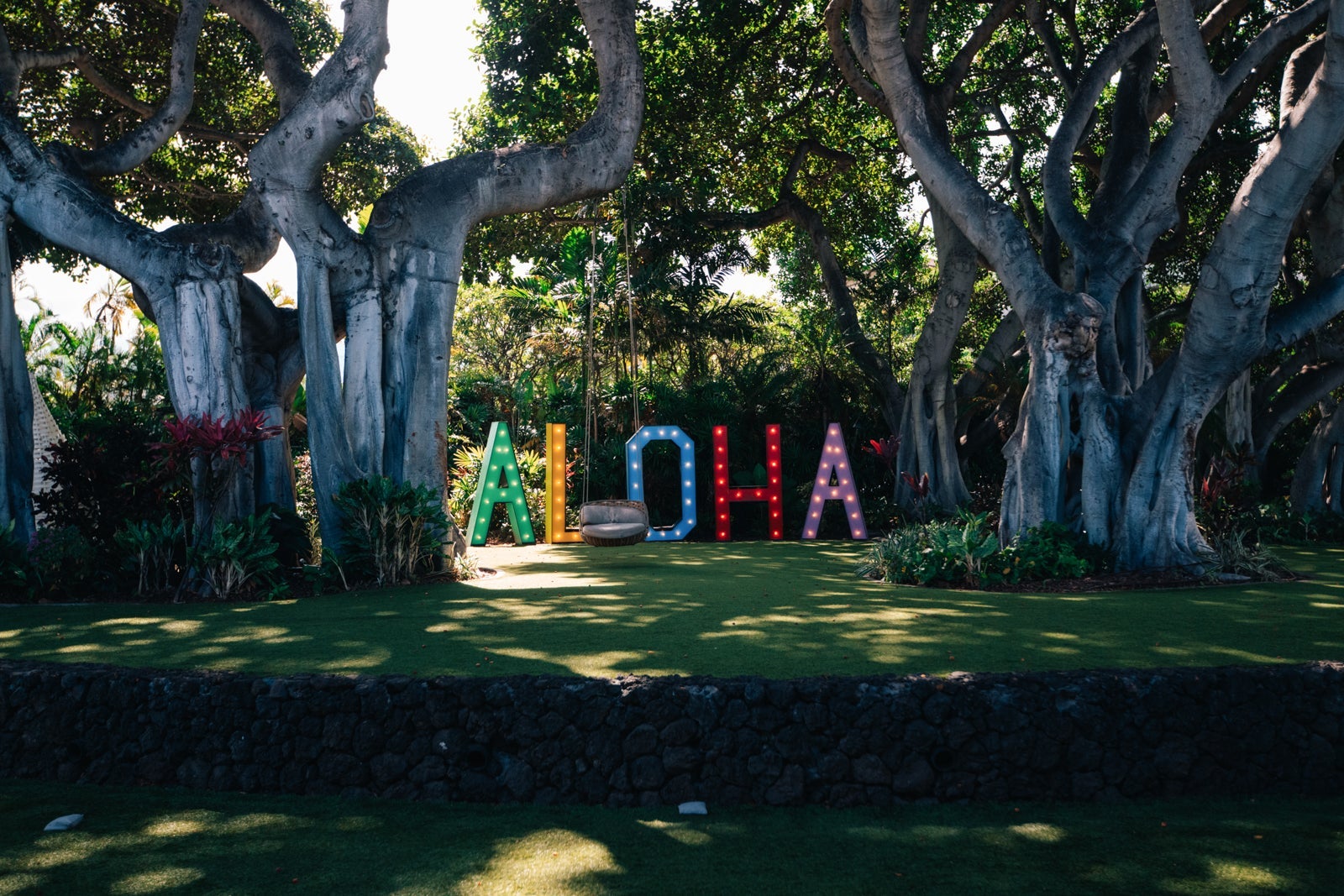 A koi pond in a raised area with a tree swing and an Instagrammable "Aloha" sign faces the front desk. My kids loved the tree swing and the koi pond, which they stopped at many times during our stay.