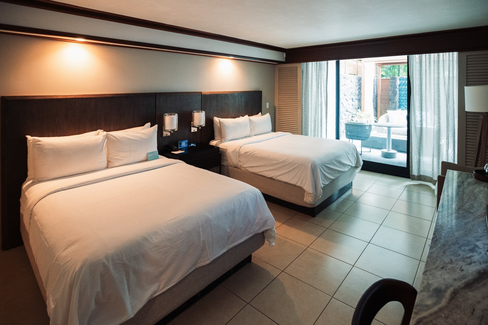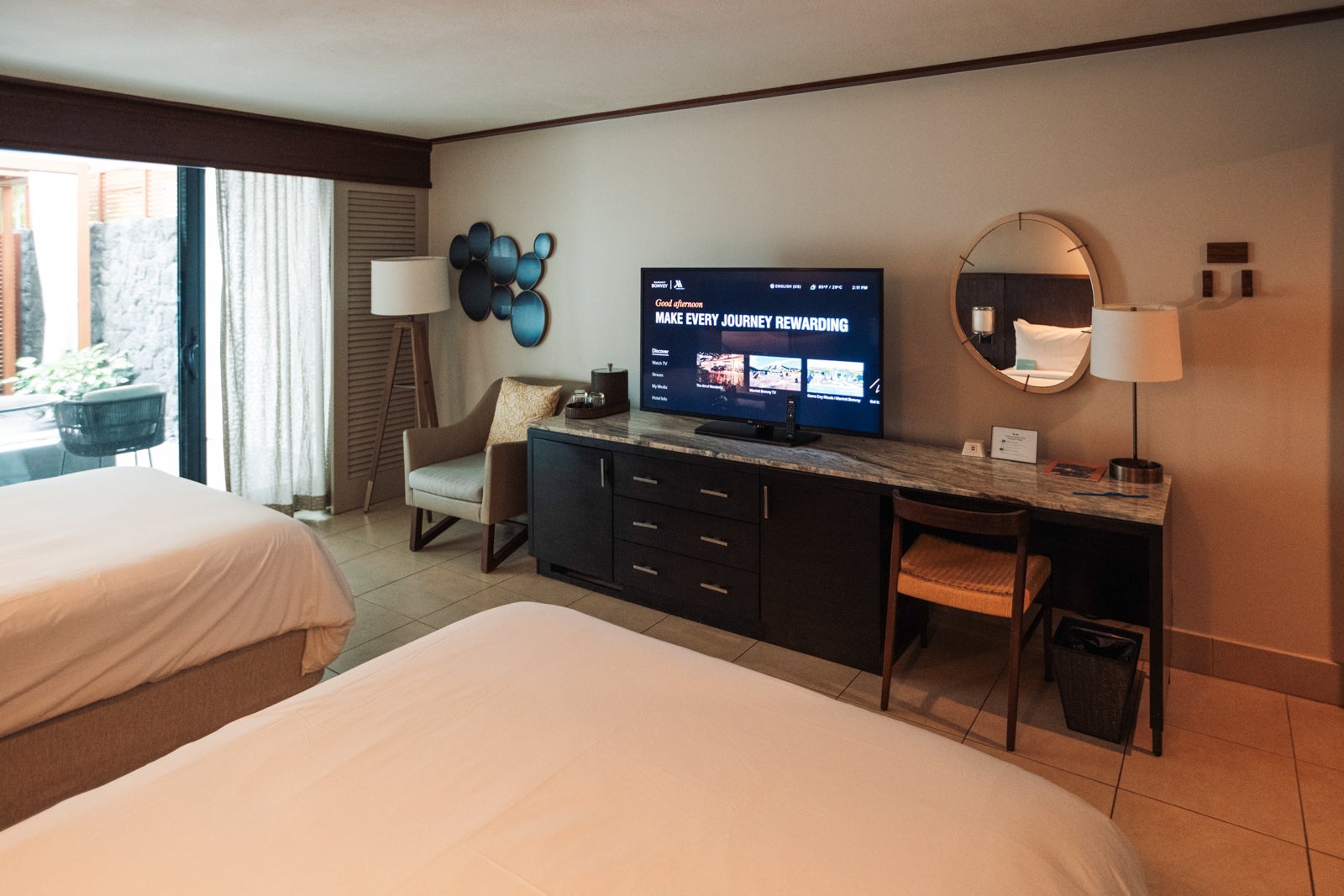 During our stay, we experienced two room types. The Garden Oasis room impressed us with its semiprivate outdoor space featuring a bathtub and shower. The outdoor area was perfect for family activities during the day and adult relaxation after the kids went down. The room itself was pretty standard, with the contemporary, tasteful decor that you'd expect from a Marriott property.