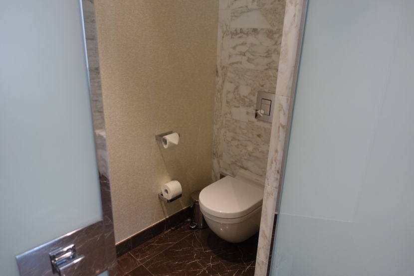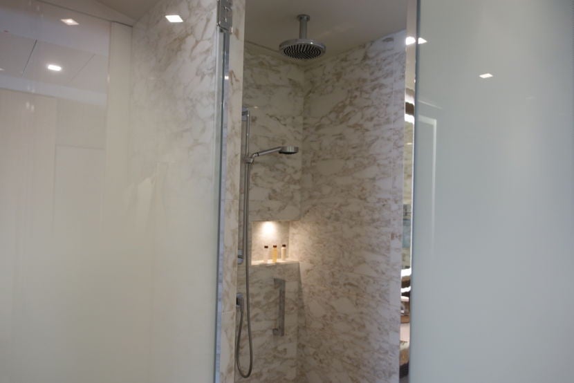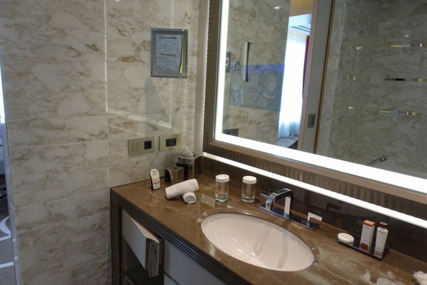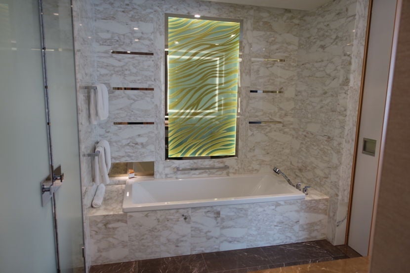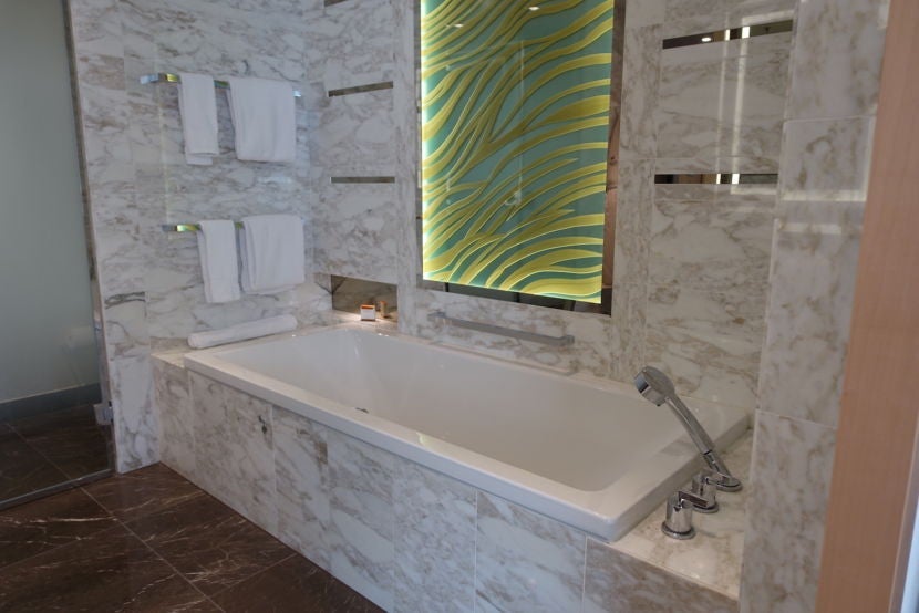 The white-marble bathroom felt pretty palatial. I loved the illuminated mirrored backsplash above the bathtub, which gave it a more elegant feel. The one drawback was that there was just a single sink when there seemed to be enough room for two of them.