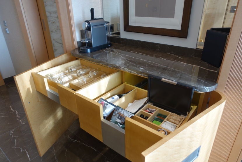 Just inside the entrance was a doorway to the bathroom. Just beyond that was the mini-bar as well as a Nespresso machine.