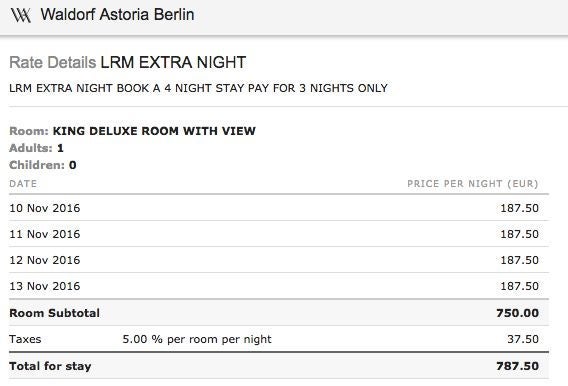 Just for reference, the Waldorf Astoria Berlin is a Category 8 Hilton property requiring 40,000 to 70,000 Hilton Honors points per night. During my stay, prices were hovering around the 70,000 points per night mark, which is part of the reason I decided to go with the paid rate instead.