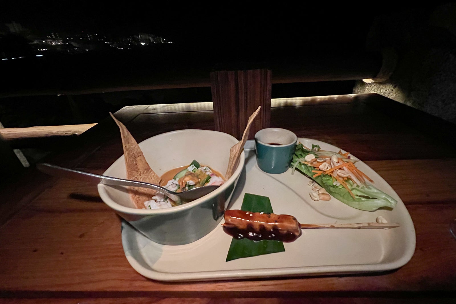 I selected the flounder, grilled with sea salt and olive oil; then the meal began. The starter was a creamy broccoli soup with vanilla and shaved cauliflower, julienned peppers and a crouton. Next was a trio of tapas including papaya salad with carrots and peanuts in a balsamic vinaigrette, grilled amberjack skewers with teriyaki-sesame glaze and michelada-style seafood ceviche in a beer-Tabasco sauce with lime.