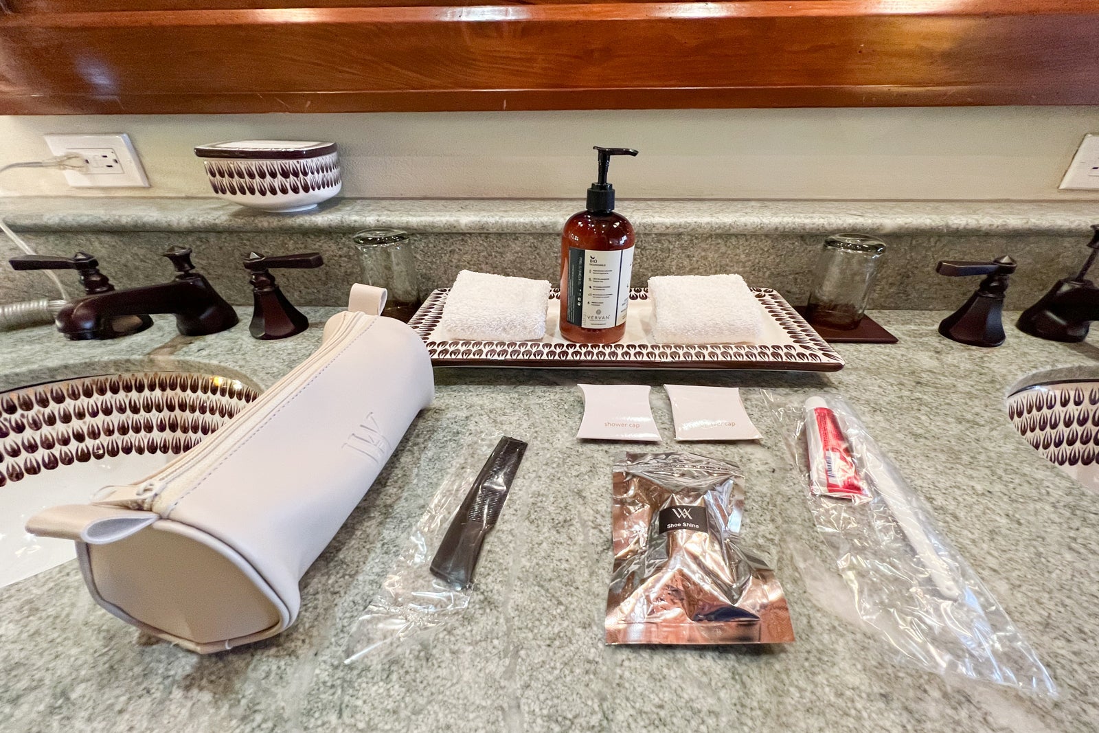 The large vanity had a greenish granite top, a huge mirror and two ceramic sinks painted white with blue patterns. The hotel provides stylish amenity kits in case you forget anything at home, and mine contained a toothbrush and toothpaste, shower caps, a shoeshine mitt and a comb.
