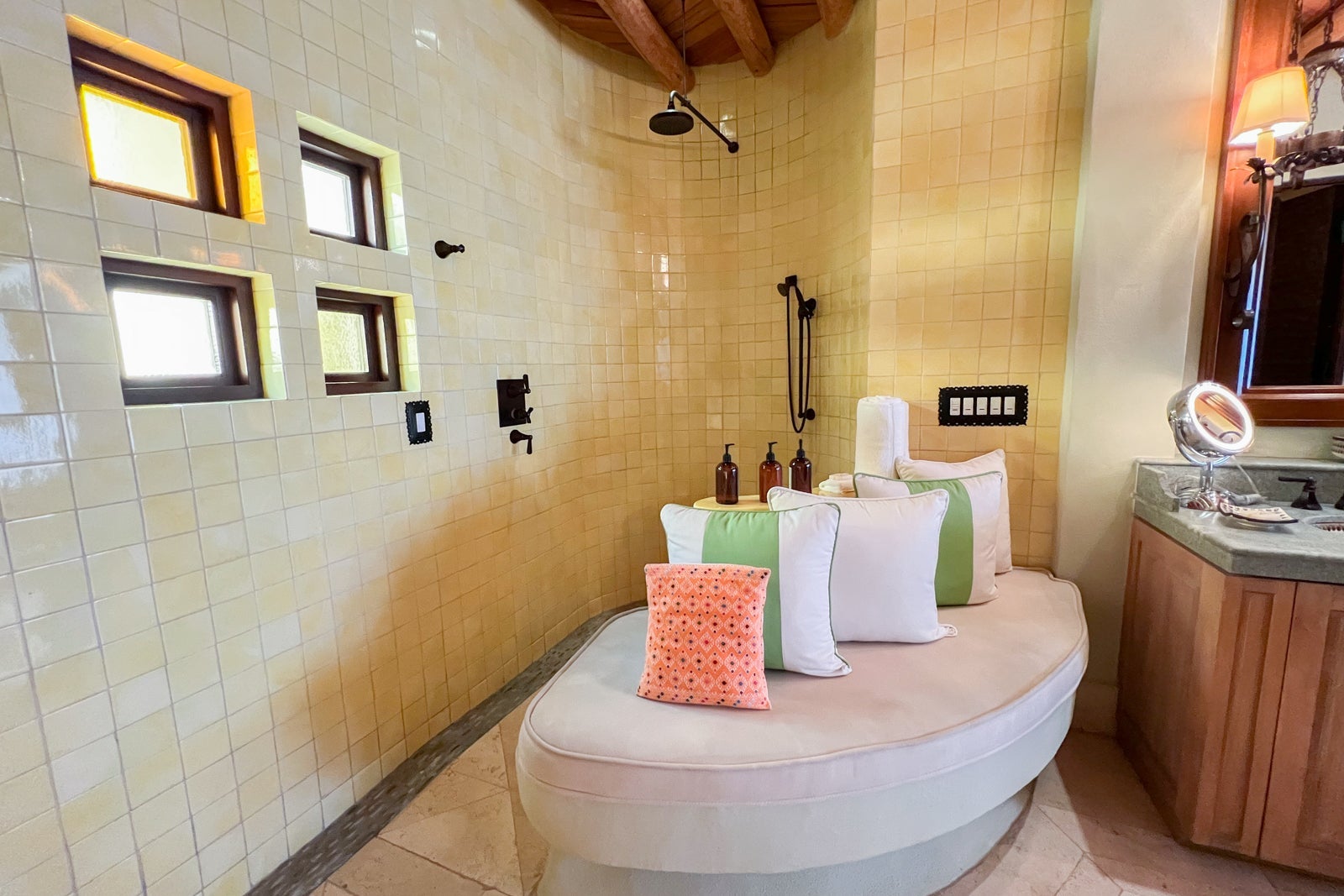 Opposite the tub was an open shower, meaning there was no door and only a half-height wall, so you could just walk in and out of it. It had both a wall-mounted handheld shower head and an overhead one. On the other side of the shower wall was a curved bench with cushions where you could just hang out, I suppose. Next to it were the five switches to control all the bathroom lights, which I found confusing since you needed to figure out how to turn them on and off, versus just dimming or brightening them, as well as which switch controlled which lights.