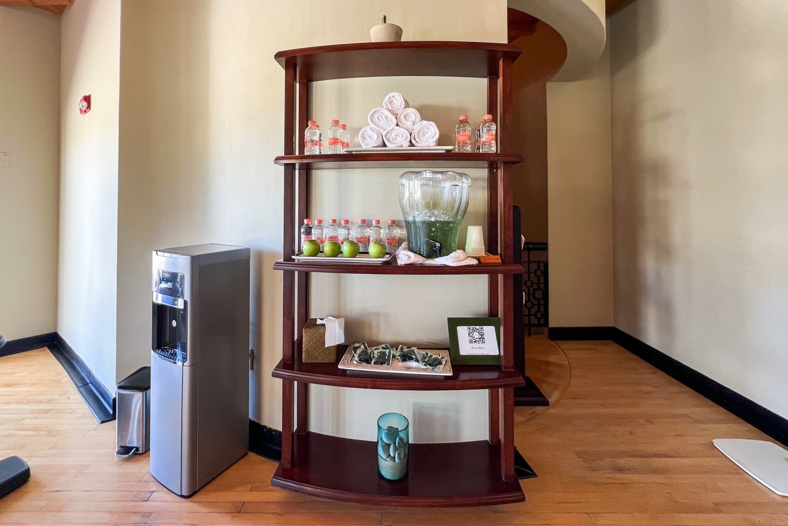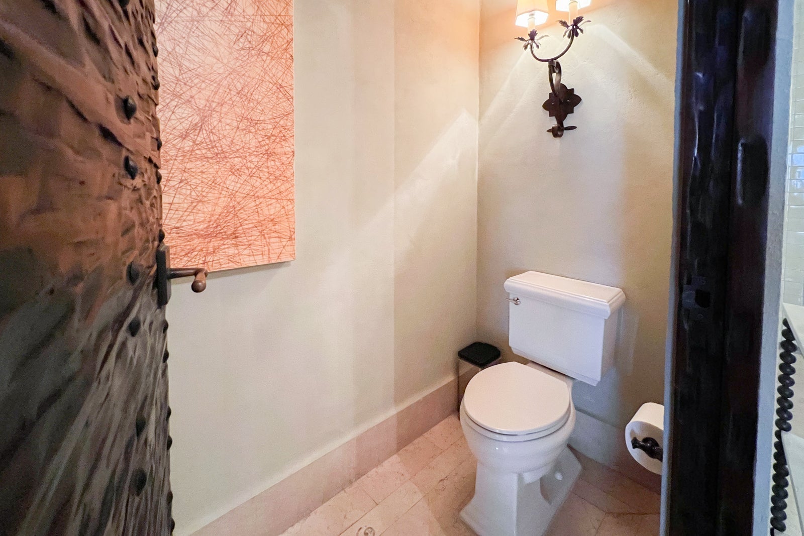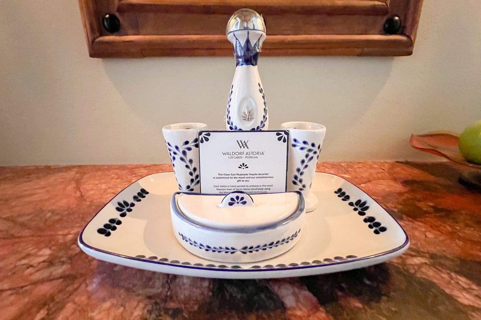 There was a small vestibule just inside the door and then a quasi-foyer with a pink, marble-topped table, two wall sconces and a mirror. There, I found a welcome amenity that included a bowl of apples and a hand-painted Clase Azul Reposado tequila decanter that I could take home with me (though its liquid volume was too big to go through security, so you'll either need to drink it or take it in a checked bag).