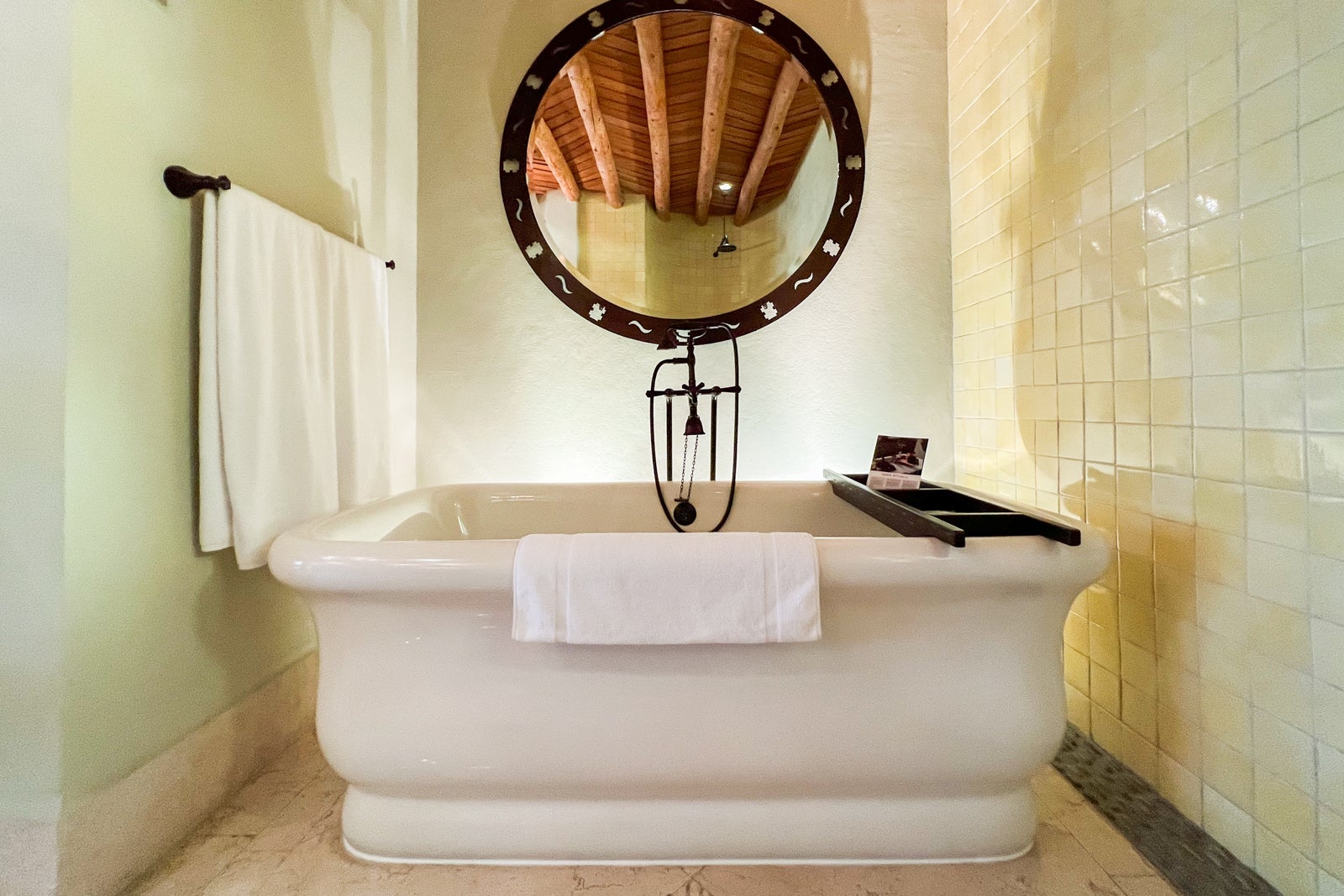 Toward the back of the bathroom, which had beautiful yellow-green glazed ceramic tiling, was a separate alcove for the standalone, deep soaking tub. It was dramatically backlit and had a mirror hanging next to it , a tray with a loofah and a jar of bath oil, and a menu of in-room bath "soak rituals" you could order that ranged in price from $75-$100 per person.