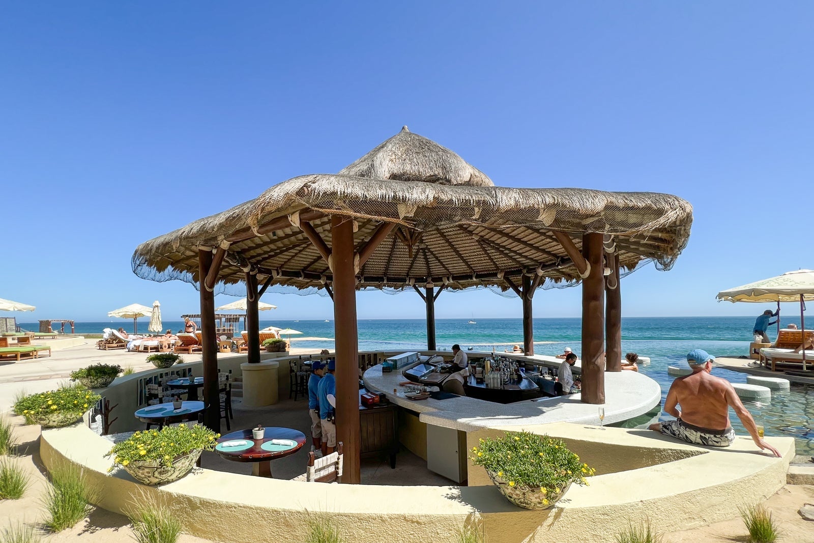Directly below the reception area is a curvaceous pool with an infinity edge facing the ocean for adults. It is surrounded by umbrella-shaded lounge chairs and has a few loungers on a shallow step in the water, too. The vibe out here was consistently quiet and sleepy, making it the perfect spot for long afternoons napping in the sun and the shade.
