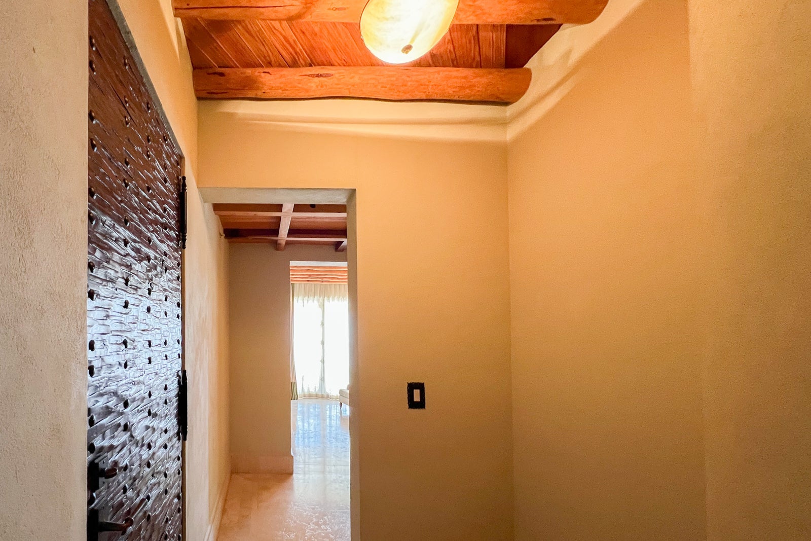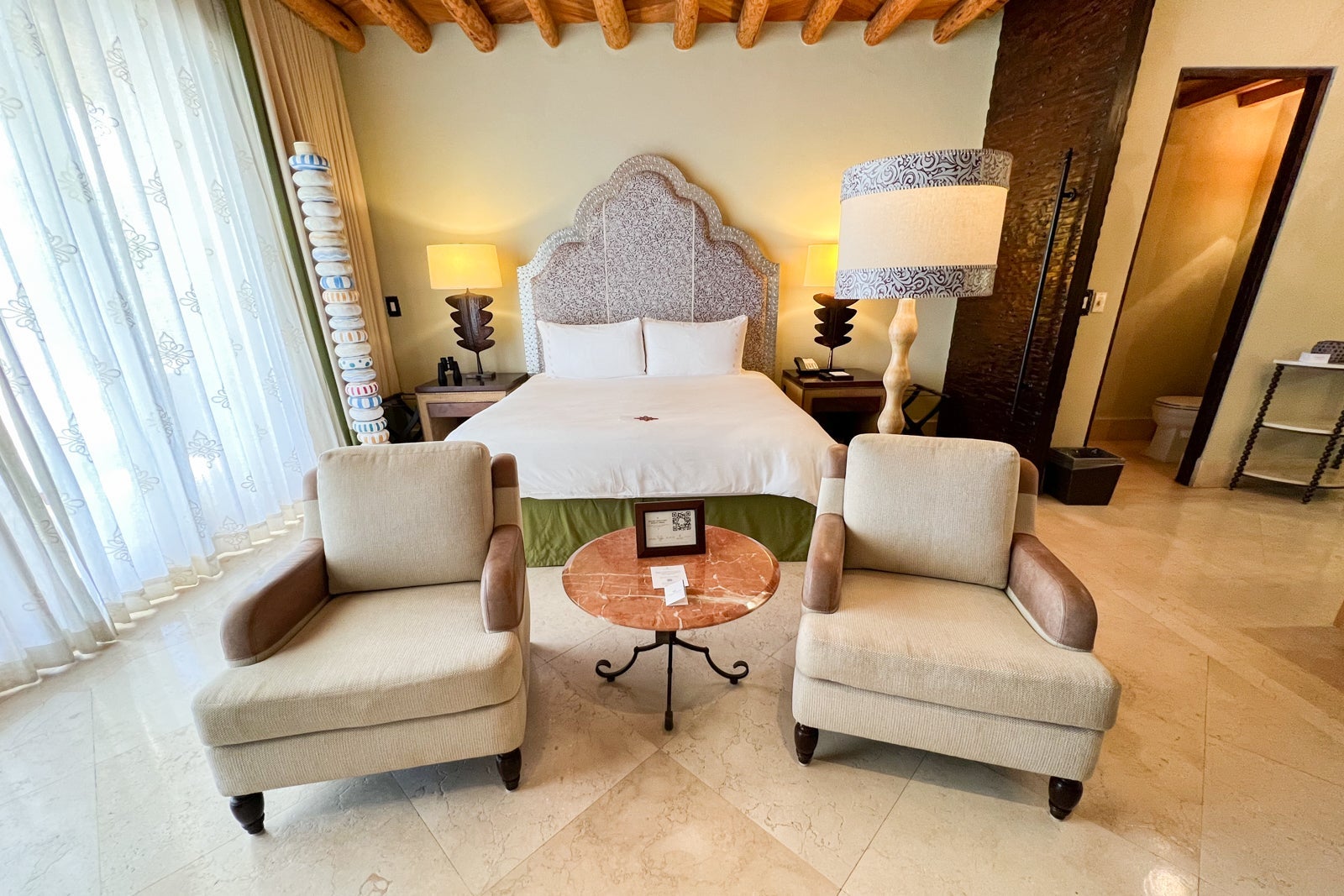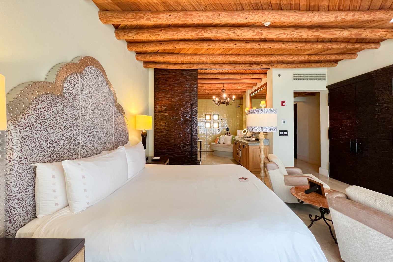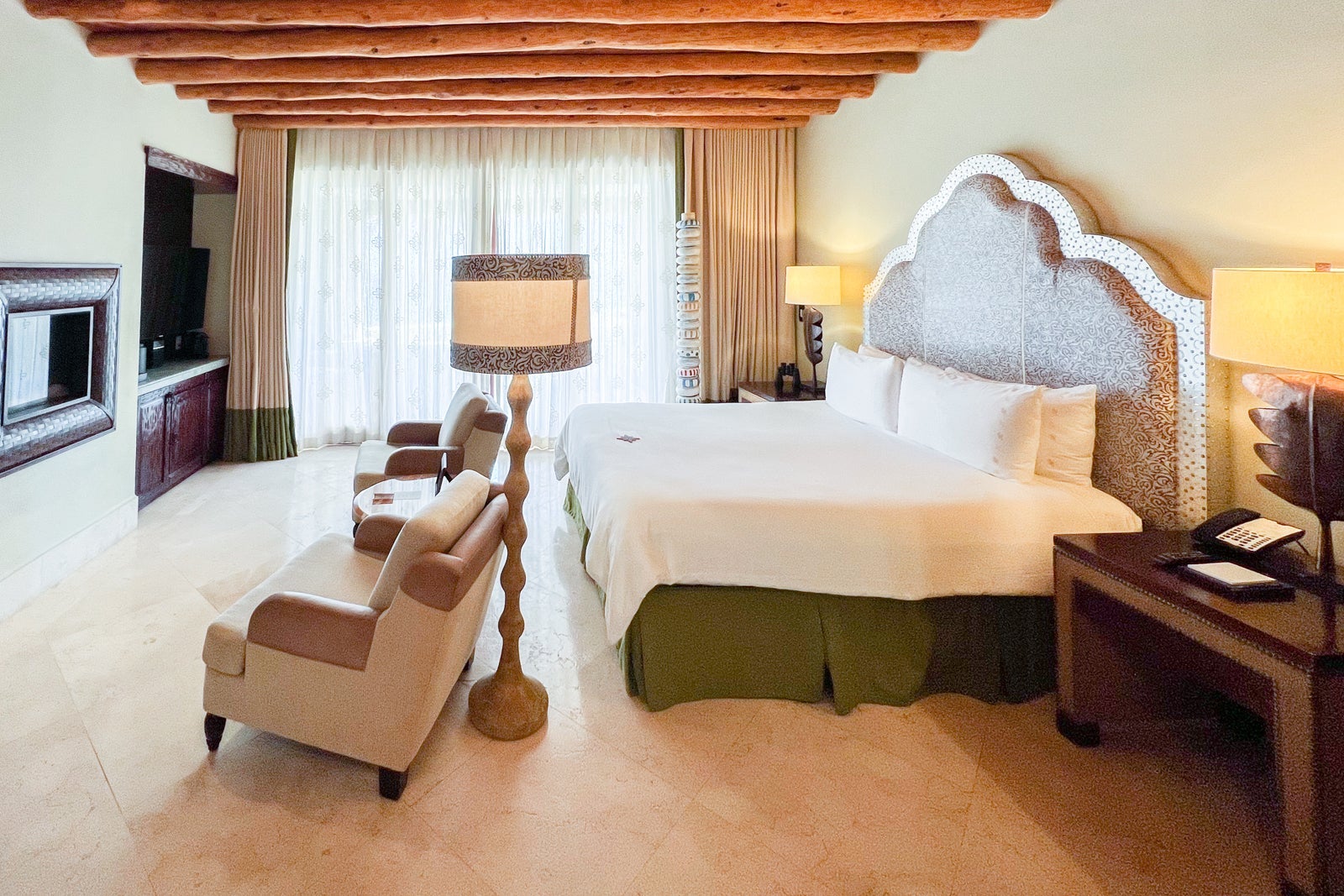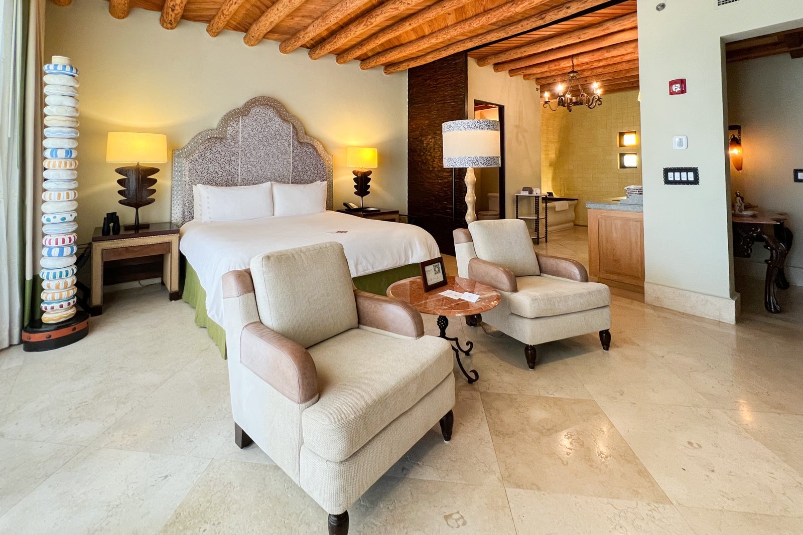 Part of what I love about this hotel is that the décor was custom-made by local artisans and includes hand-carved mesquite furniture (not to mention those beautiful beamed ceilings), bed headboards of embossed leather with sculpted metal frames and colorful totem-like sculptures.