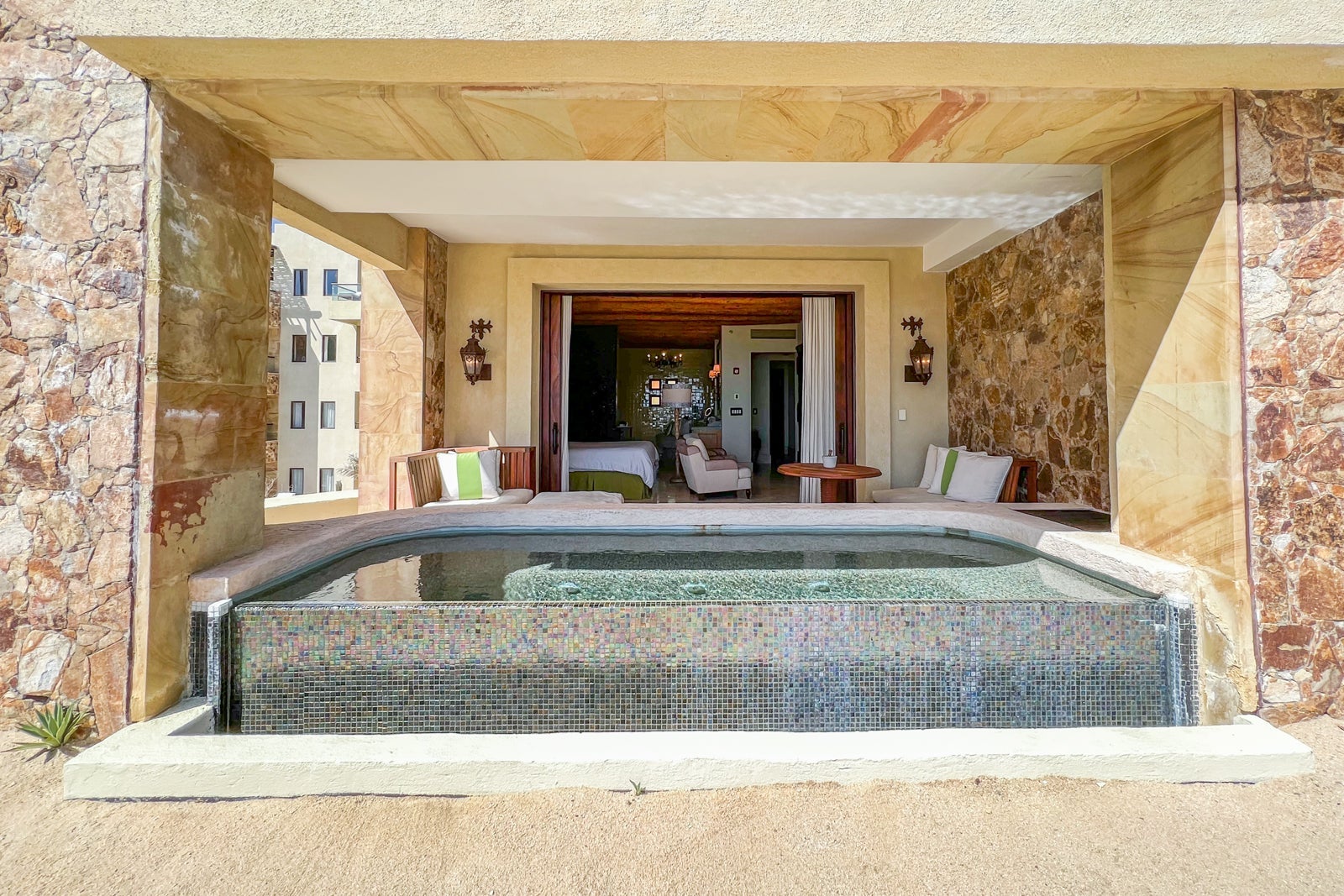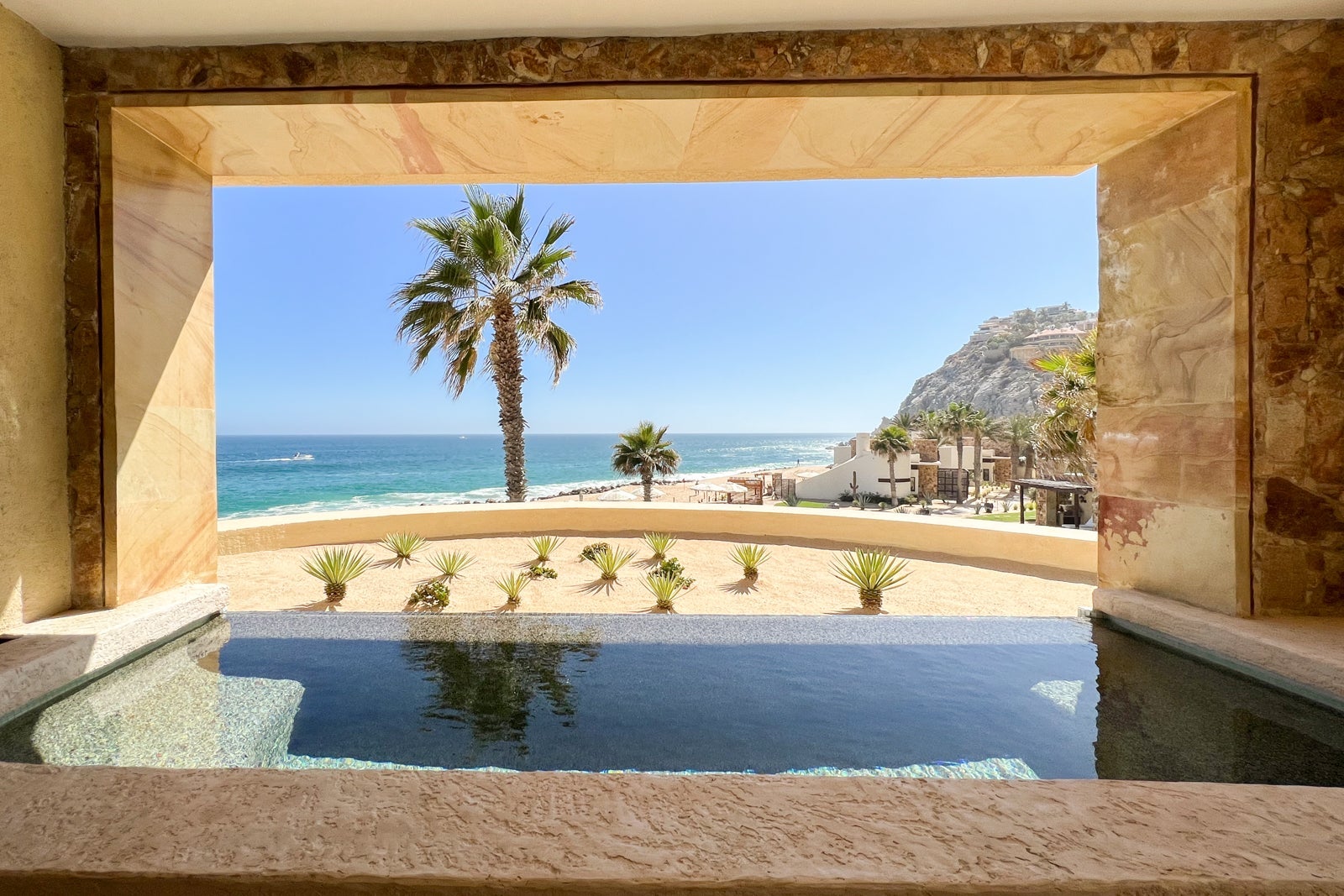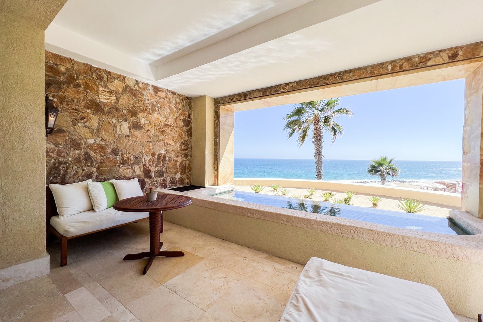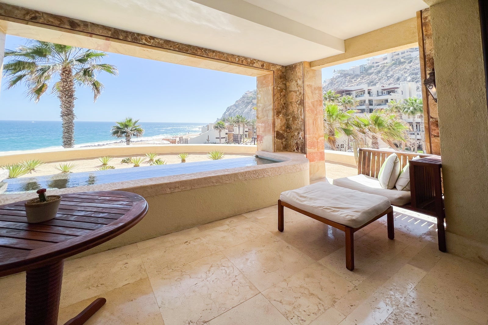 The terrace had two low, cushioned benches, one with an oversize, cushioned stool and the other with a wooden table that functioned well as a desk when I wanted to work outside. The plunge pool was a small rectangle with rounded-off corners and a no-slip stone bottom and stairs, though its infinity edge was made of black, iridescent tiles. Beyond that was a small sandy area with little succulents planted for decorative purposes, and then one of the resort pools — with the ocean beyond that.