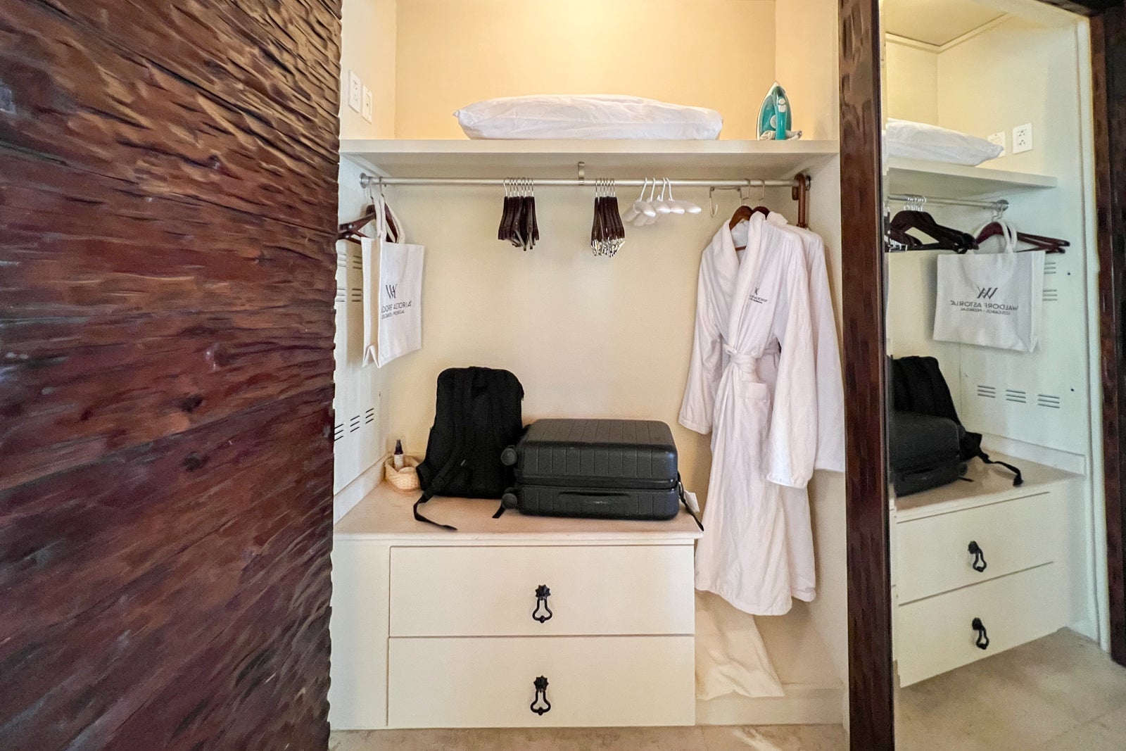 To one side of that was the closet, which had drawers and a shelf as well as a rack for hanging clothes and a surface area that could have easily fit either a full-size suitcase or two carry-ons.