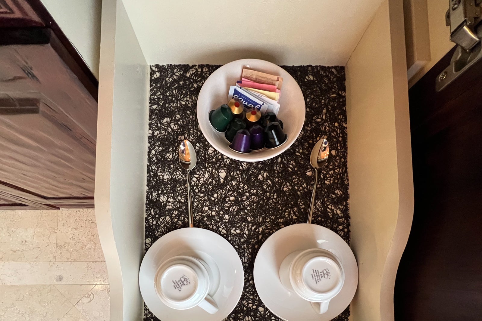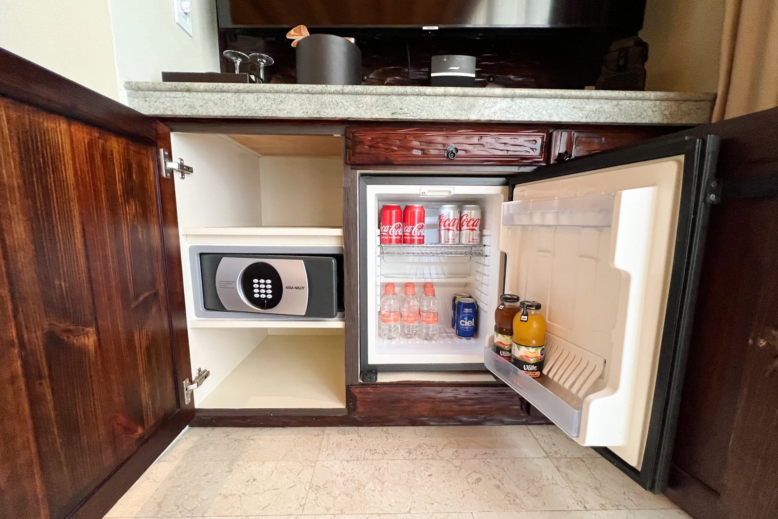 Inside the cabinet, there were coffee cups and pods along with sugar. The minifridge was stocked with bottles of water and cans of soda water, Coca-Cola and Diet Coke plus two bottles of juice, all of which were complimentary. The other cabinet held the room safe.