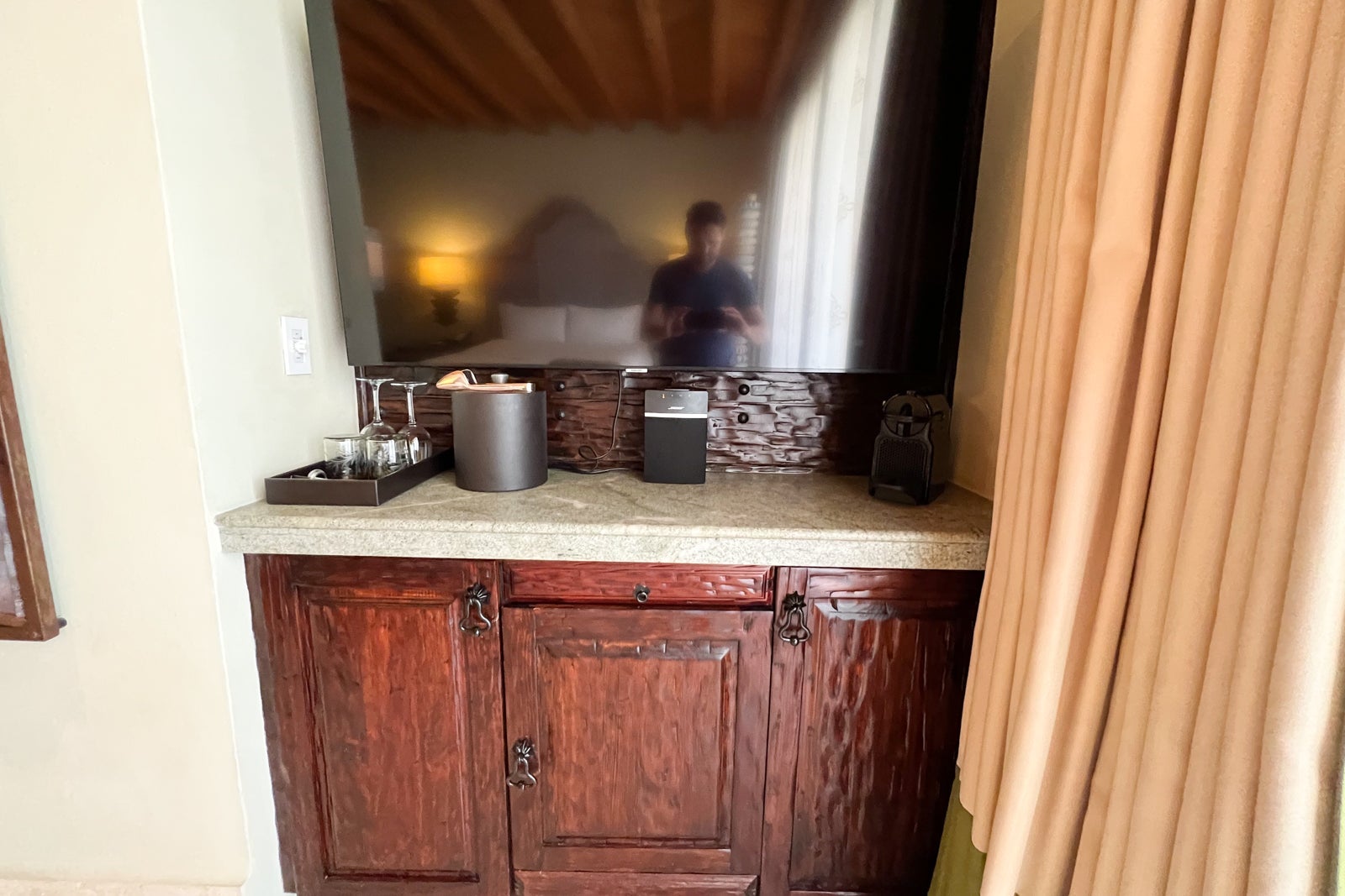 To the other side of the fireplace was a large, wall-mounted LCD TV and a stone-topped wooden counter. On the counter, I found an ice bucket and both wine and water glasses plus a Nespresso coffee machine.