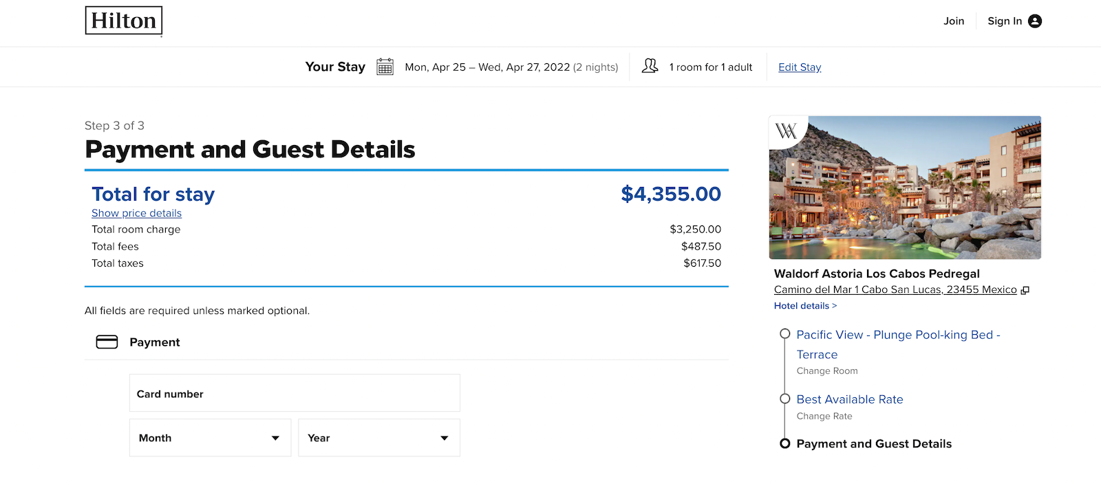 I found two nights that worked for my plans and I booked a standard Pacific View – Plunge Pool King Bed Terrace room. Paid rates for the same nights would have cost a staggering $1,625 apiece, plus taxes and fees; my two-night total would have been $4,355.