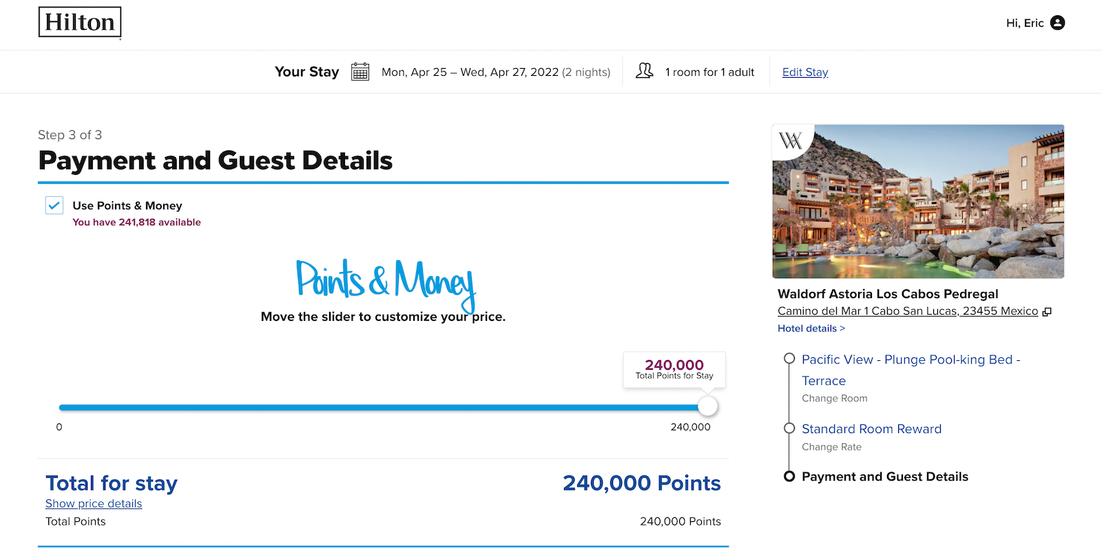 Instead, I was able to take advantage of a Hilton Honors points purchase bonus of 100%, buying the 240,000 points for just $1,200. That saved me over $3,000 on the stay, and got me a per-point value of 1.8 cents apiece, three times TPG's valuation of Hilton points at 0.6 cents each.