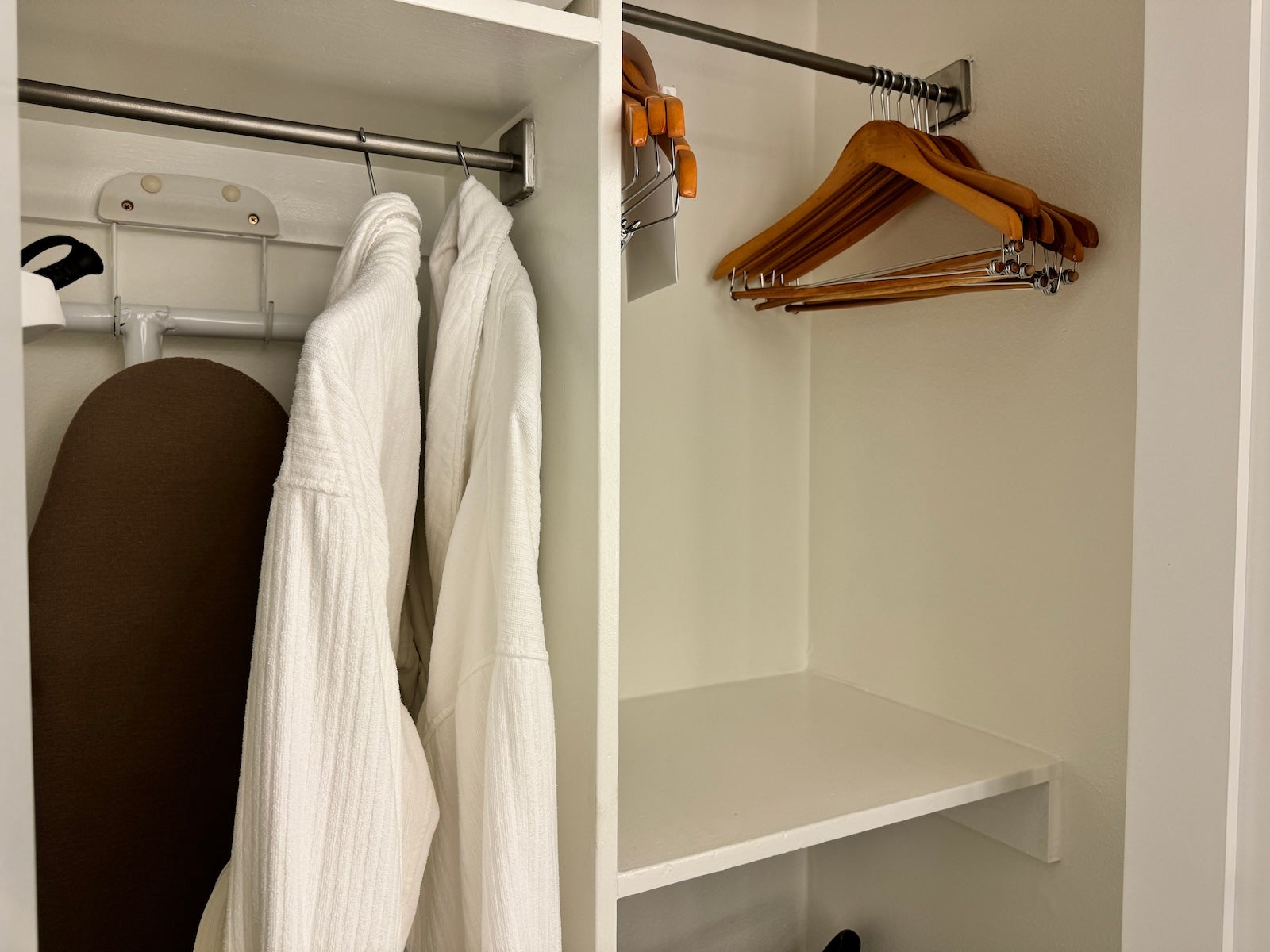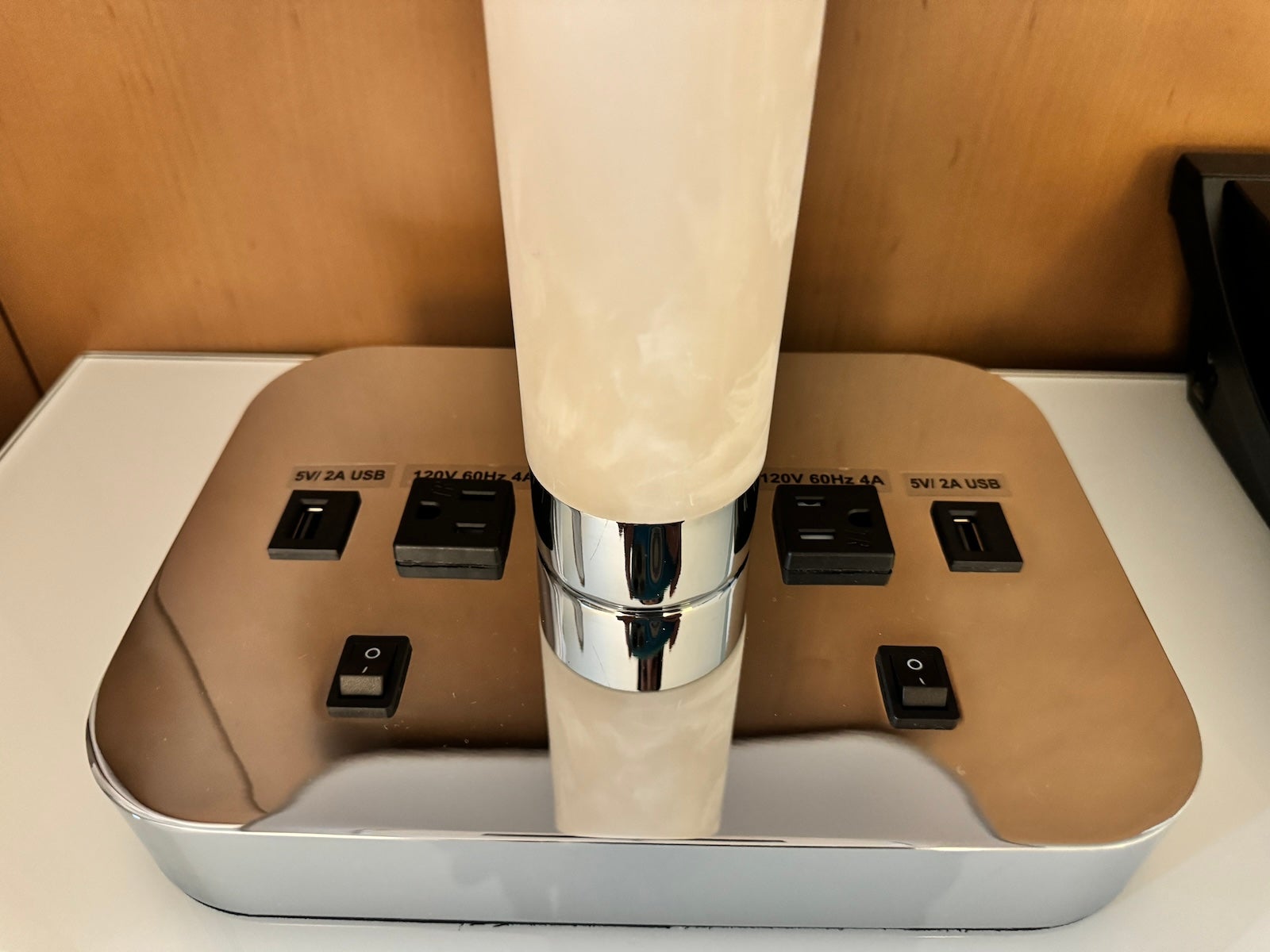 The room was spacious, with plenty of closet space for storage, as well as high beds that you could slide a suitcase under. The beds featured wooden headboards with white cushioning, a bedside lamp between the two beds and plenty of standard USB and USB-C outlets.