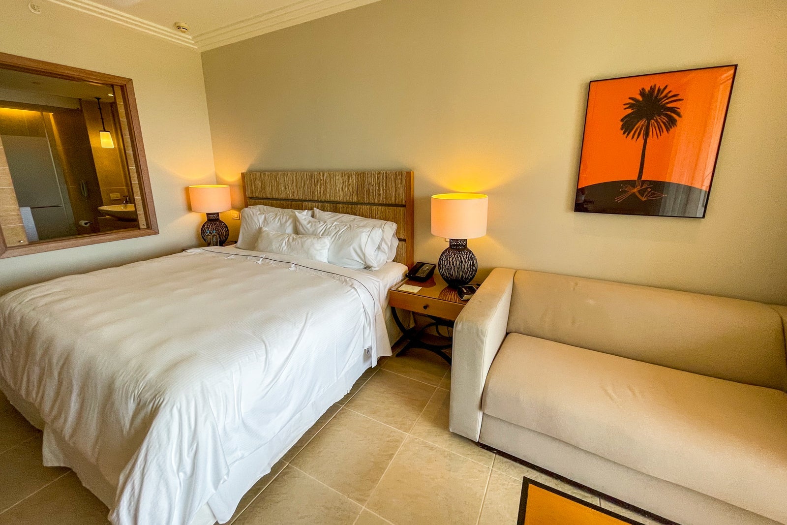 It was quite spacious — with a king bed, seating area and desk. It matched the rest of the resort's aesthetic: neutral tones with wood and stone fixtures.