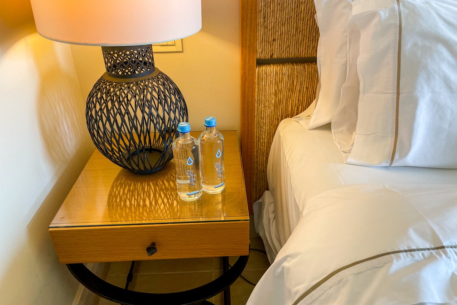A couple of waters were on the bedside table, and housekeeping was excellent about restocking them every day.