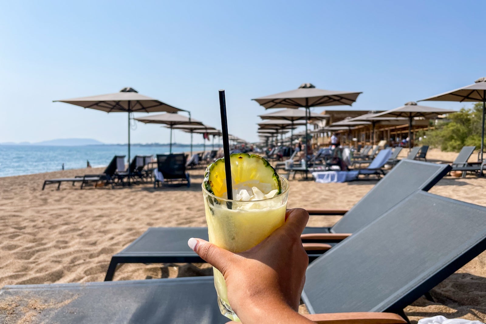 After scarfing down those gyros, I visited the beach. There's a beachside restaurant and bar, but you can order drinks from your beach chair. You can check out my terrific piña colada topped with shaved coconut and a slice of pineapple below, which set me back 20 euros ($23.50)