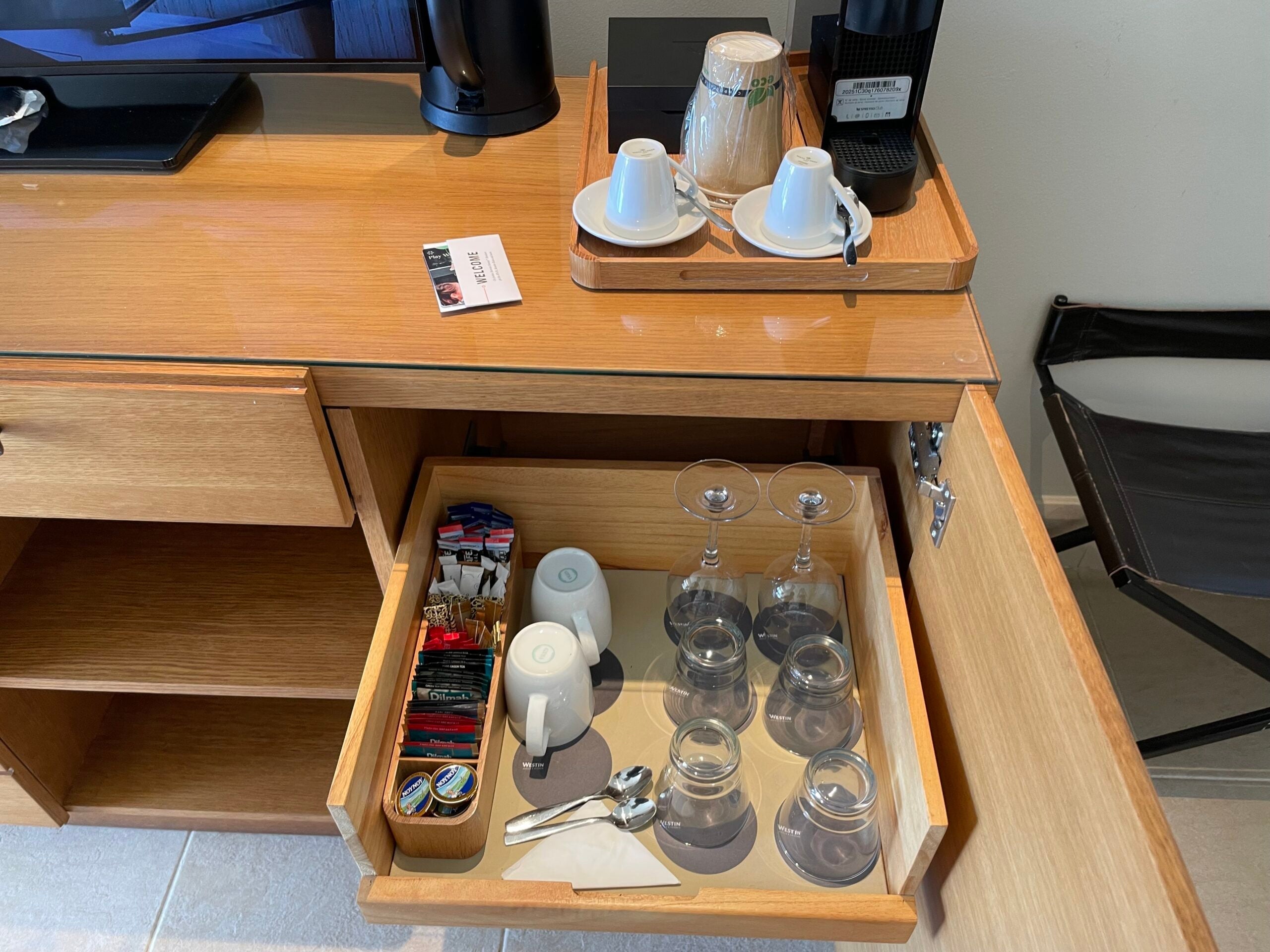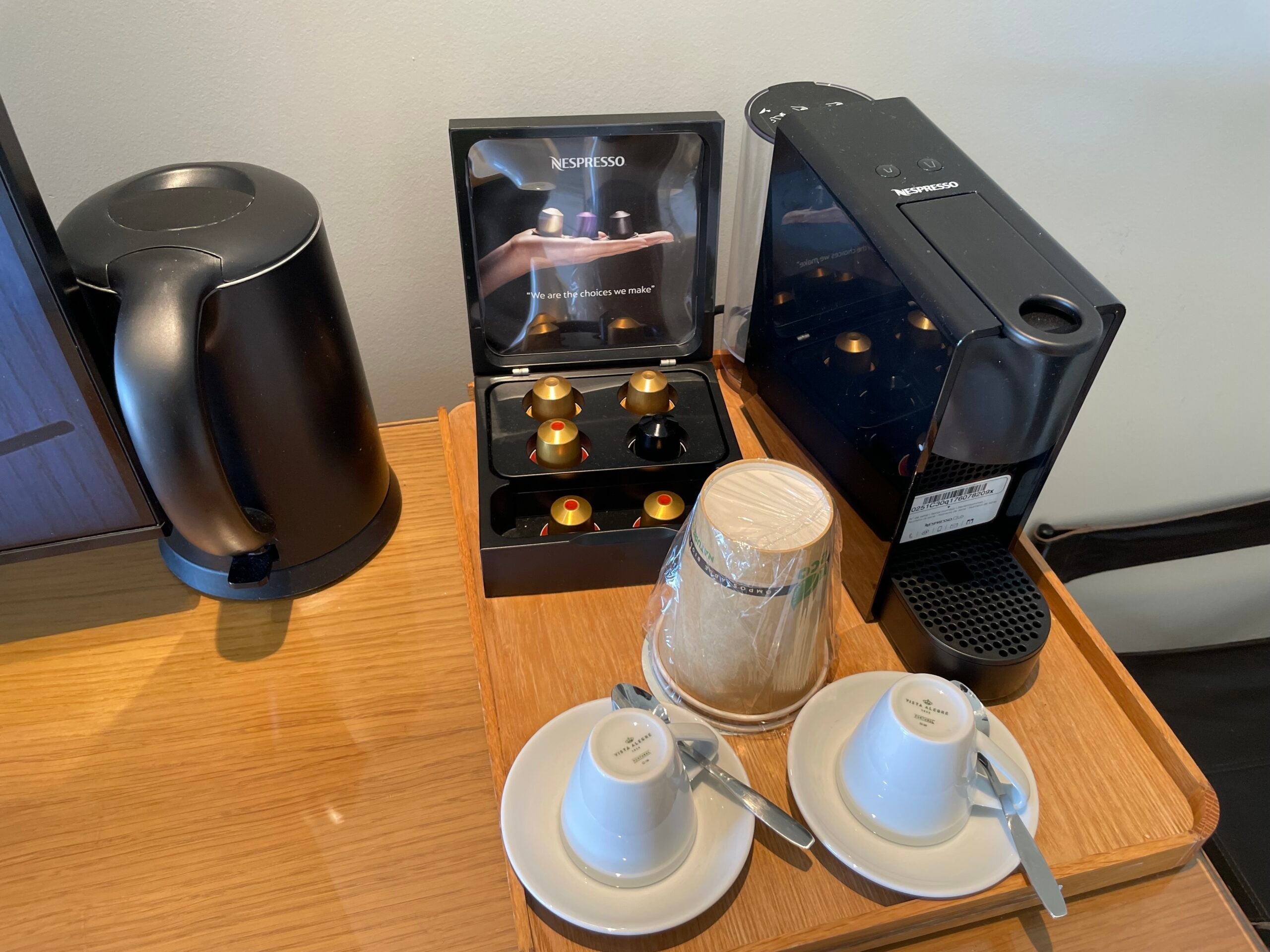 There's a flatscreen television and a Nespresso machine (with plenty of Nespresso pods) sitting squarely in front of the bed.