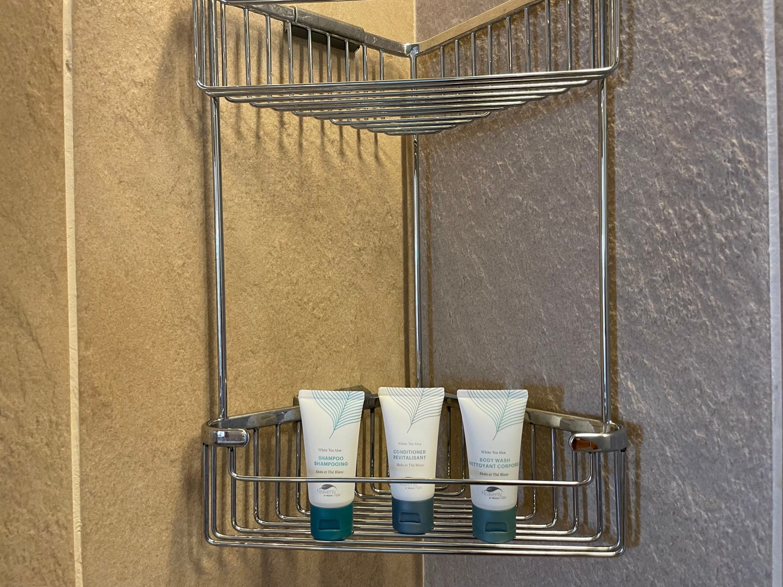 The bathroom had a double vanity sink, an alcove bathtub and a sliding glass door for the toilet and shower. You can find mini shampoo, conditioner and body wash on the sink and in the shower. There were plenty of fresh towels under the sink and two bathrobes — one hanging in the bathroom and the other hanging in the hallway closet.