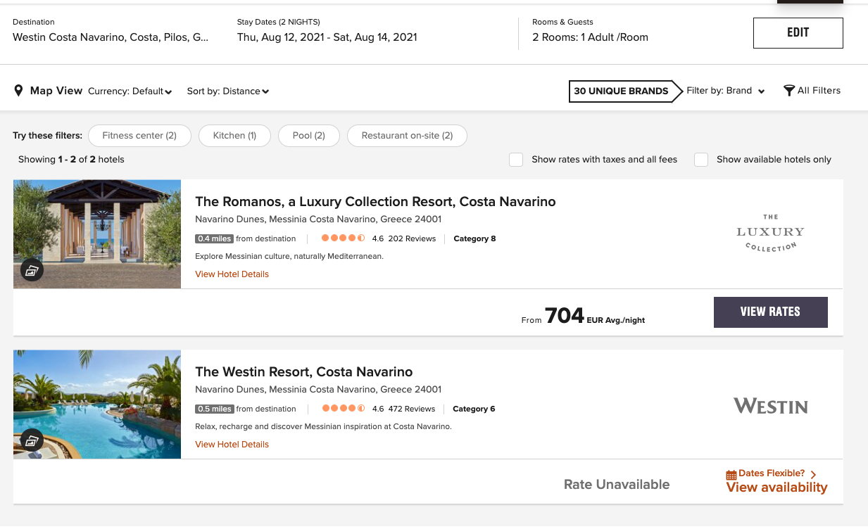 Award availability can be hit or miss with The Westin, Costa Navarino. (Screenshot courtesy of Marriott)