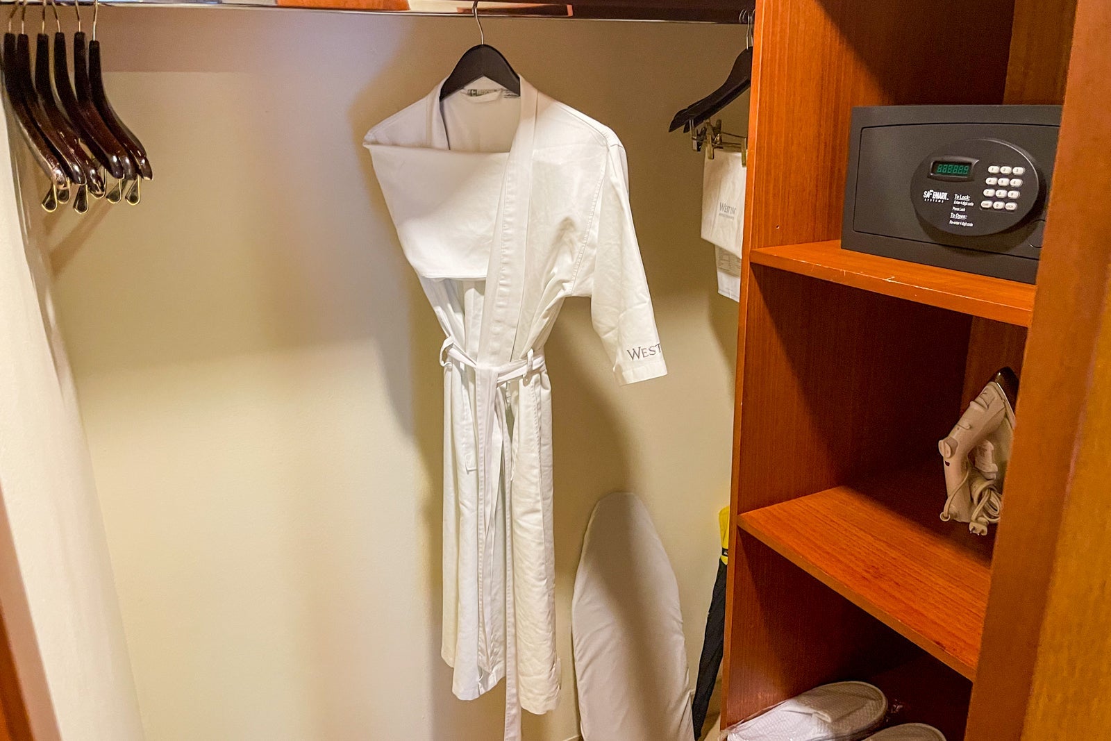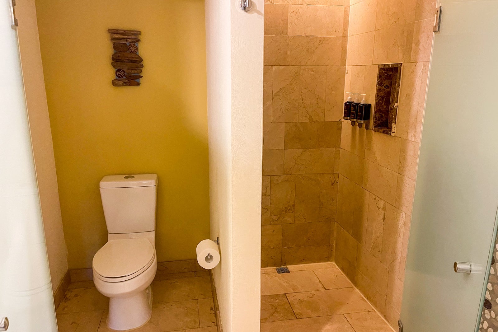 The bathroom had a large soaking tub and wooden bathtub tray, a rain shower head and single sink. Though the bathroom was nice overall, there were some dingy spots, like the frosted glass peeling on the shower door, and the separated toilet area was pretty dark.