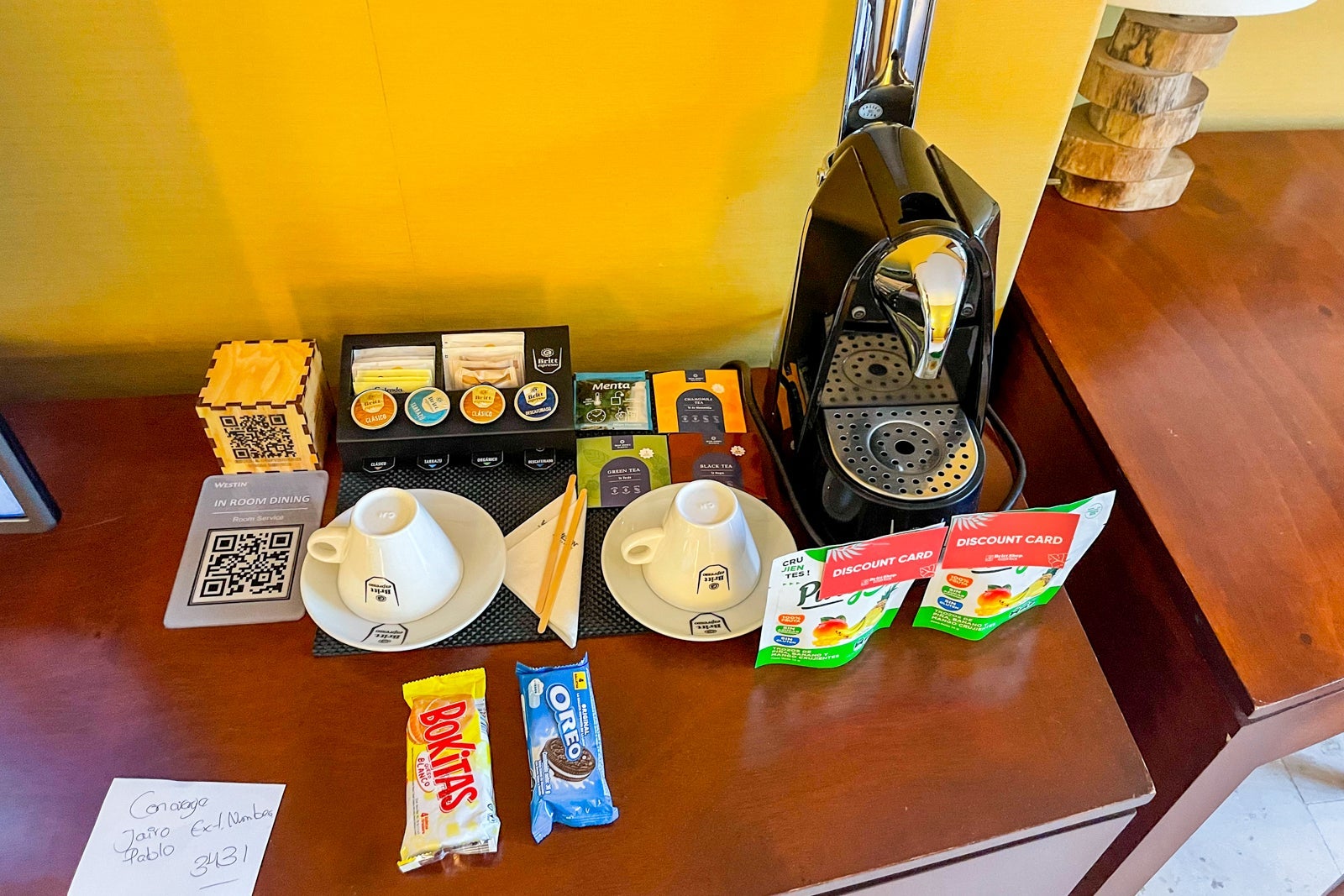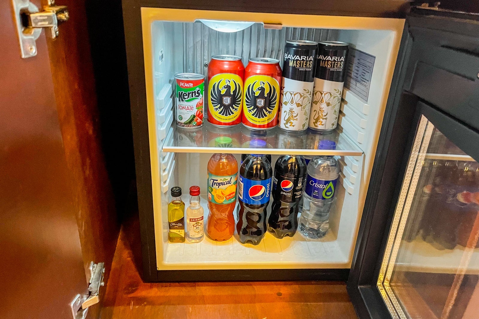 The minifridge had canned Imperial and Bavaria Masters beer, two types of juices, Pepsi sodas and miniature spirits bottles along with bottled water. There was also an automatic coffee maker, teas, Oreo cookies and Bokita cookies.