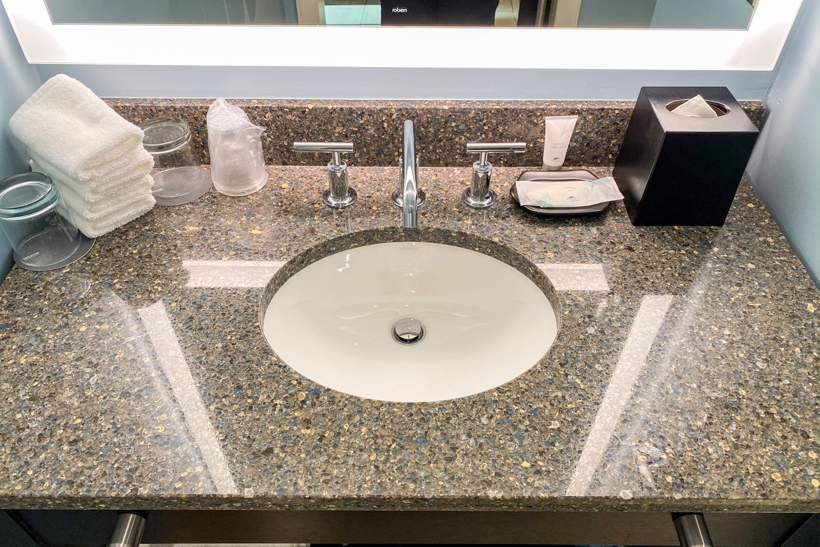 The bathroom was small. The single vanity was large enough for two people but would definitely get tight if you're sharing the room with friends or children.