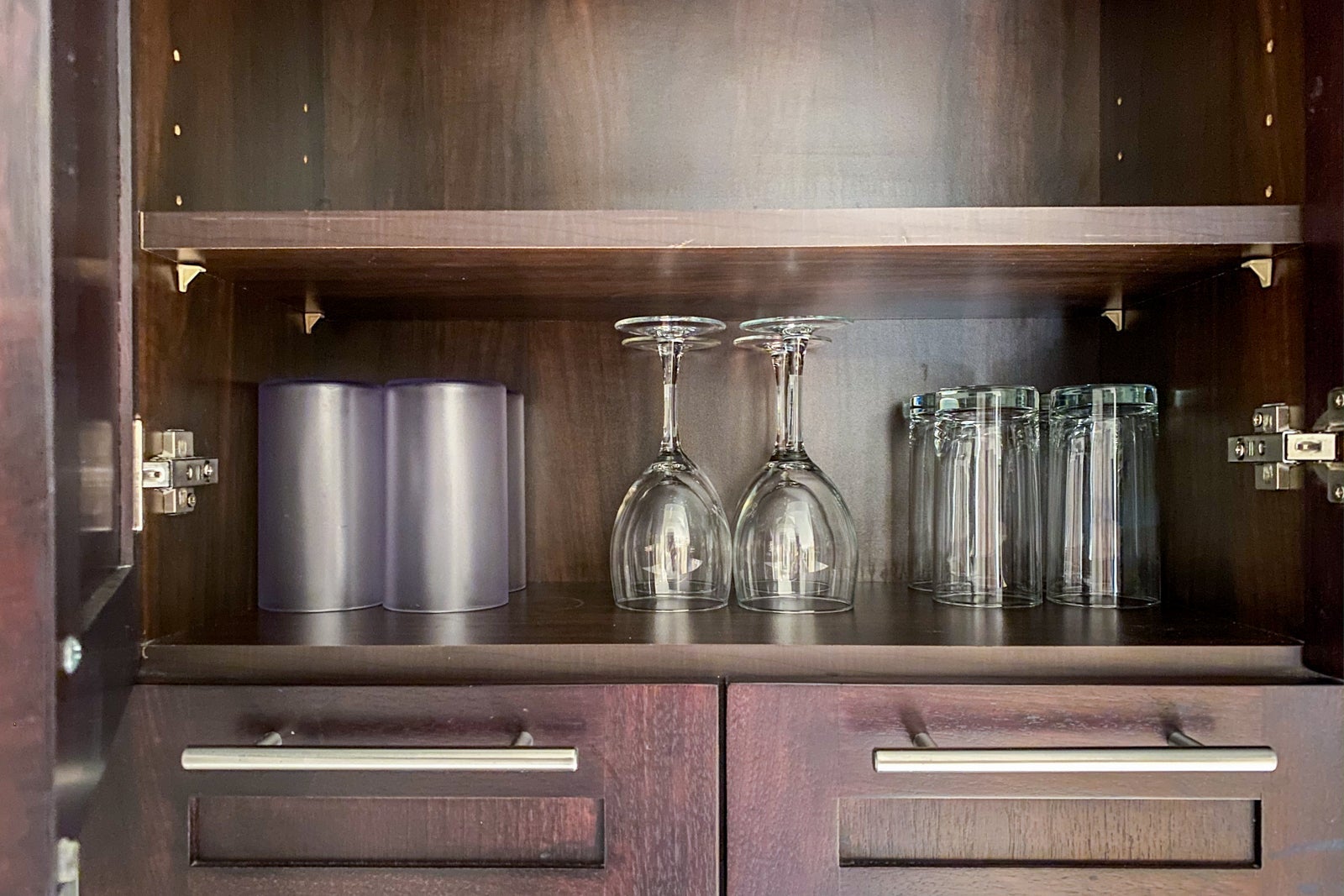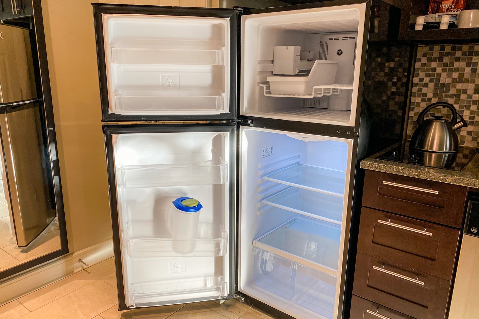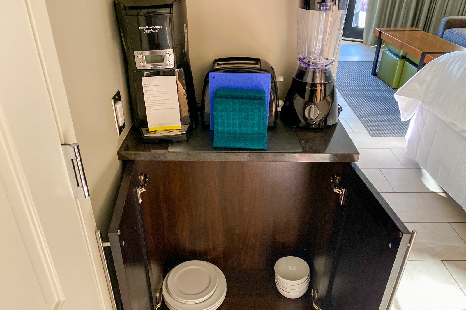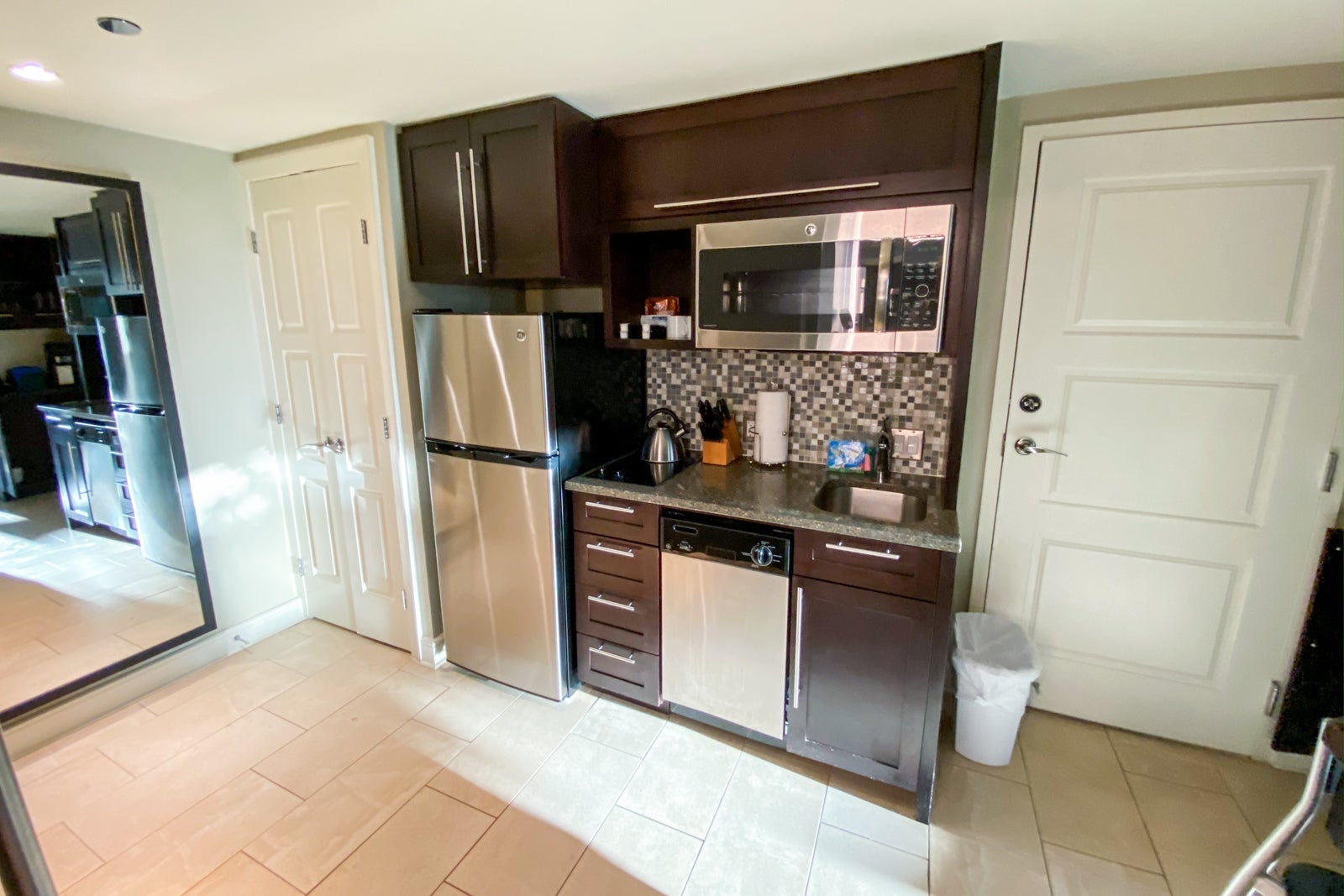 I was impressed that the kitchen had plenty of dishes and utensils. The only missing appliance was an oven, and the only missing feature was a minibar.