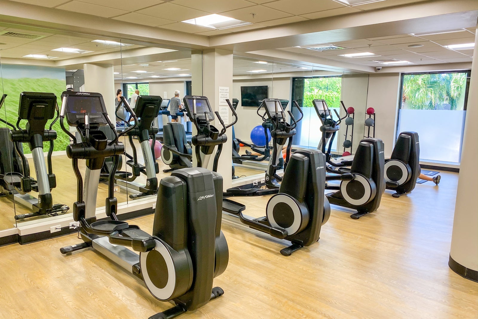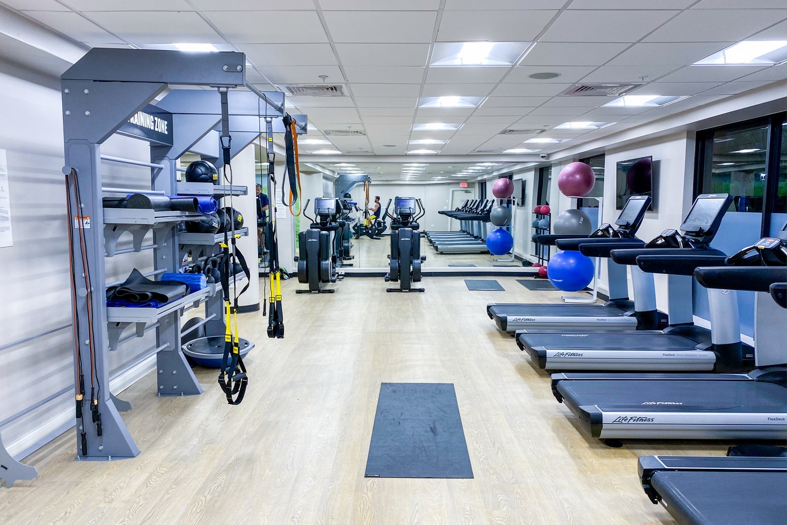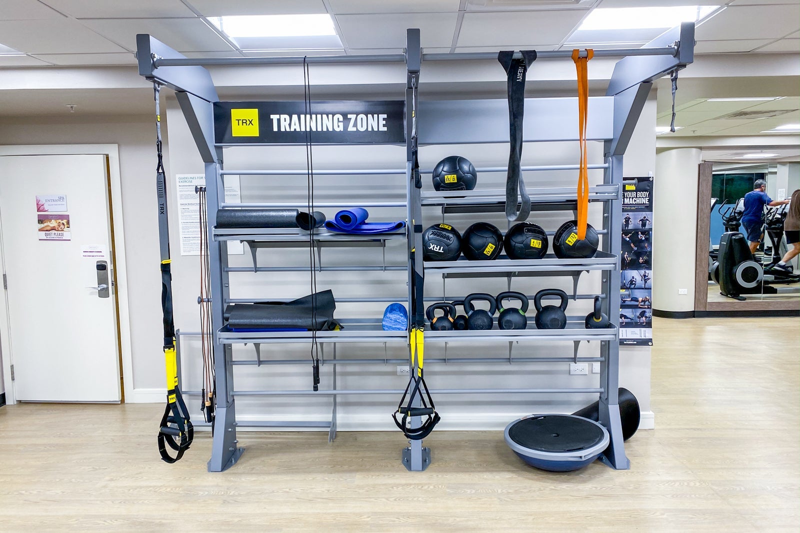 The hotel's gym and spa are near the main lobby. The 24/7 gym was split between a cardio and strength-training room. The cardio room featured a good assortment of brand-new Life Fitness equipment, including four ellipticals, six treadmills and two bikes, as well as a TRX resistance training zone.