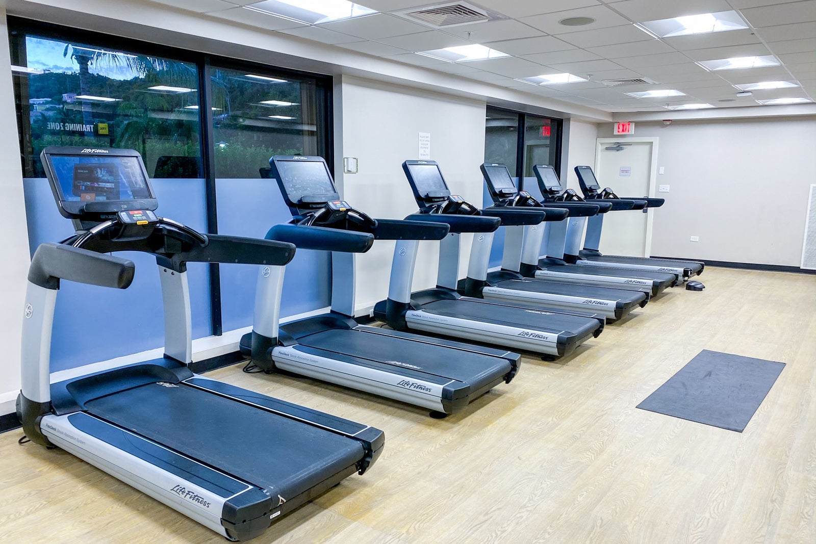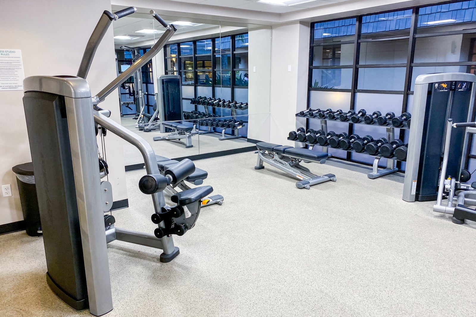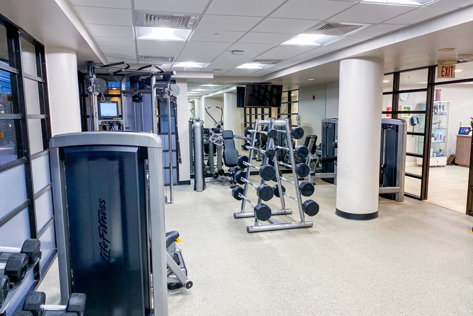 The hotel's gym and spa are near the main lobby. The 24/7 gym was split between a cardio and strength-training room. The cardio room featured a good assortment of brand-new Life Fitness equipment, including four ellipticals, six treadmills and two bikes, as well as a TRX resistance training zone.