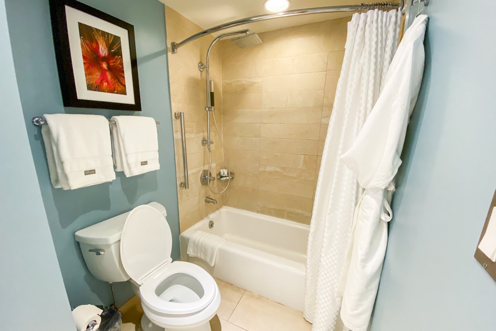 The toilet and shower were all in the same room. The shower definitely didn't pass the TPG shower test, and the water pressure was noticeably weak.