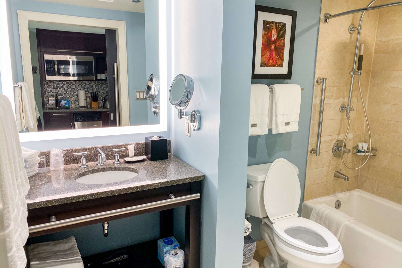 The most family-friendly feature in the room was the washer and dryer. I was there for only one night, but it could come in handy during an extended vacation, especially with kids. I particularly appreciated that the hotel left laundry detergent and dish soap for your use during your stay.