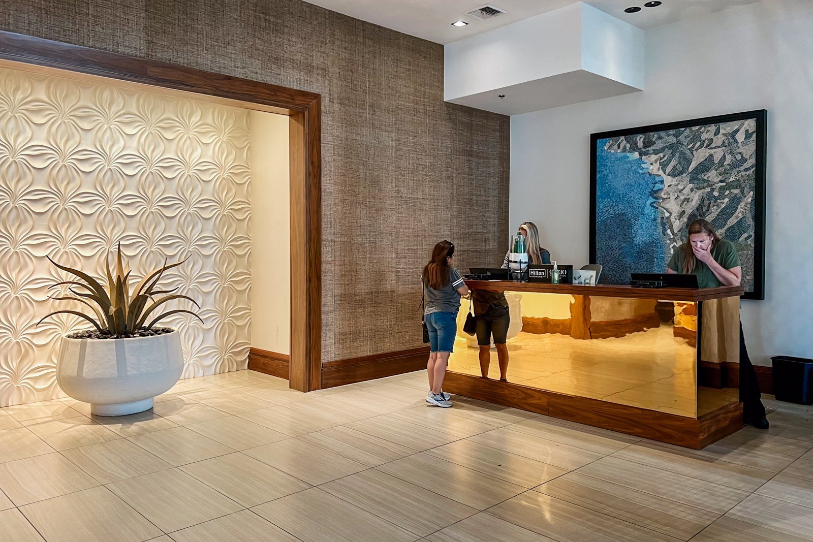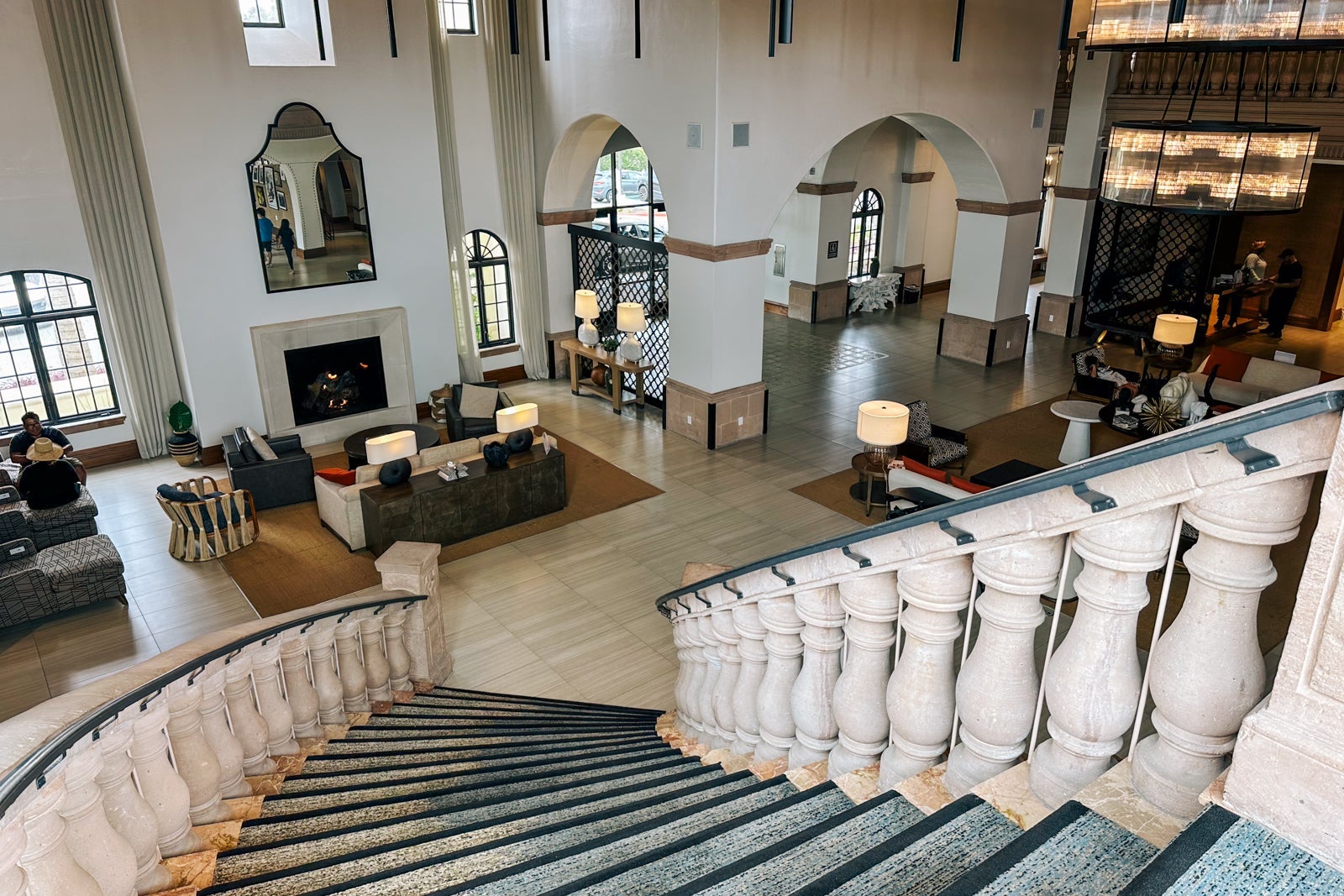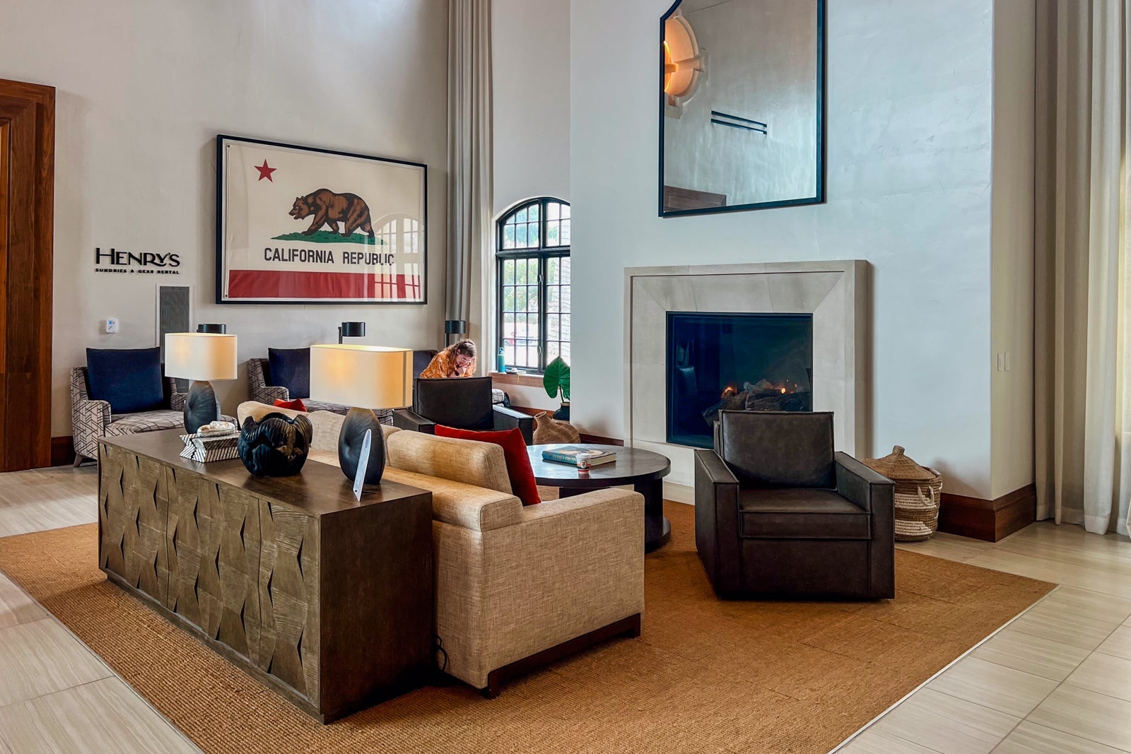 The lobby, in particular, is open and inviting with dramatic high ceilings, gorgeous lighting and sleek sitting areas with a fireplace and coworking spaces.