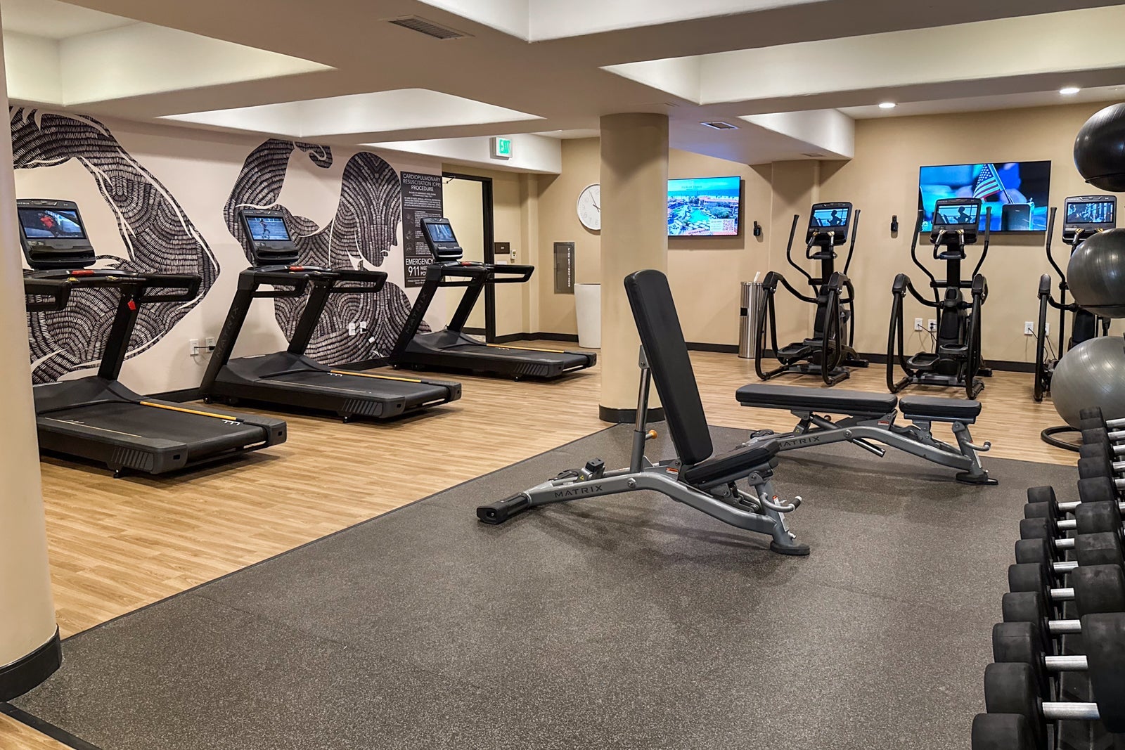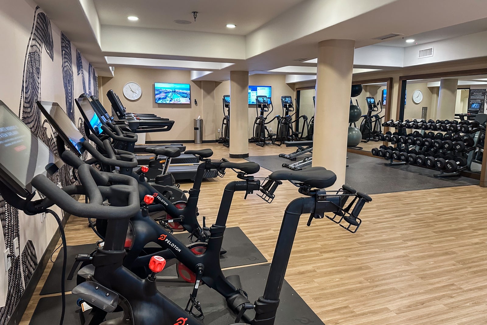 Next to the game room was a spacious fitness center with plenty of cardio equipment including Peloton bikes, as well as free weights and weight machines and separate areas for stretching.