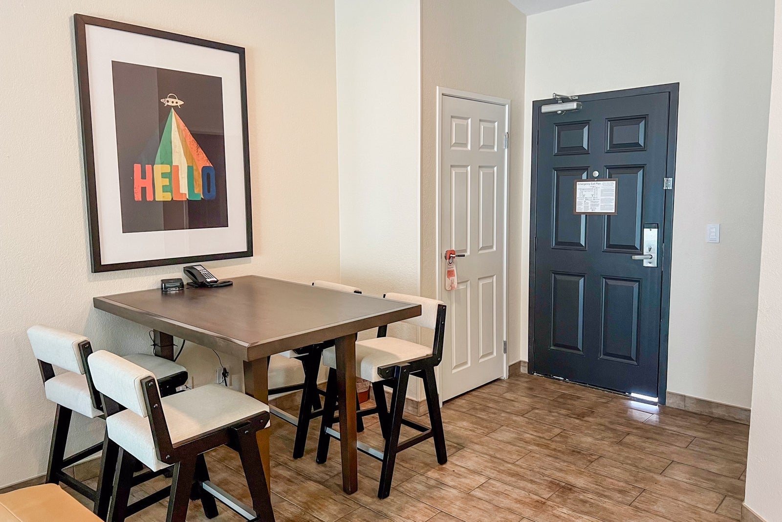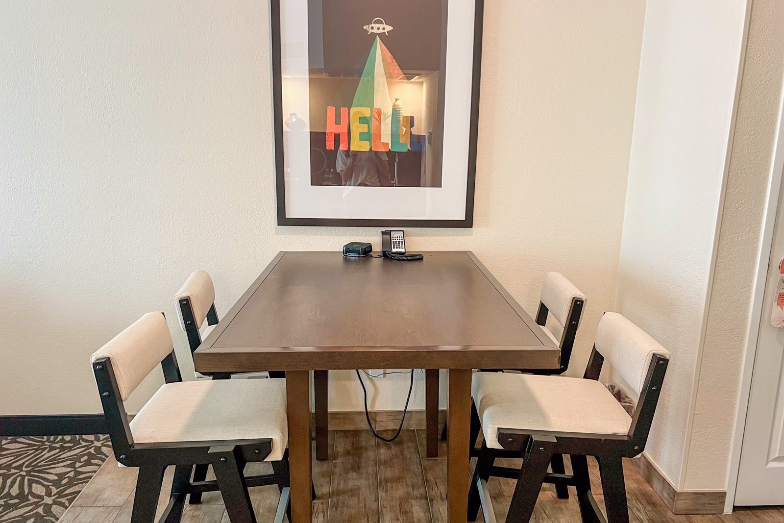 When I opened my door, I was greeted by a spacious room with a high-top dining table and four chairs a few steps in front of me.