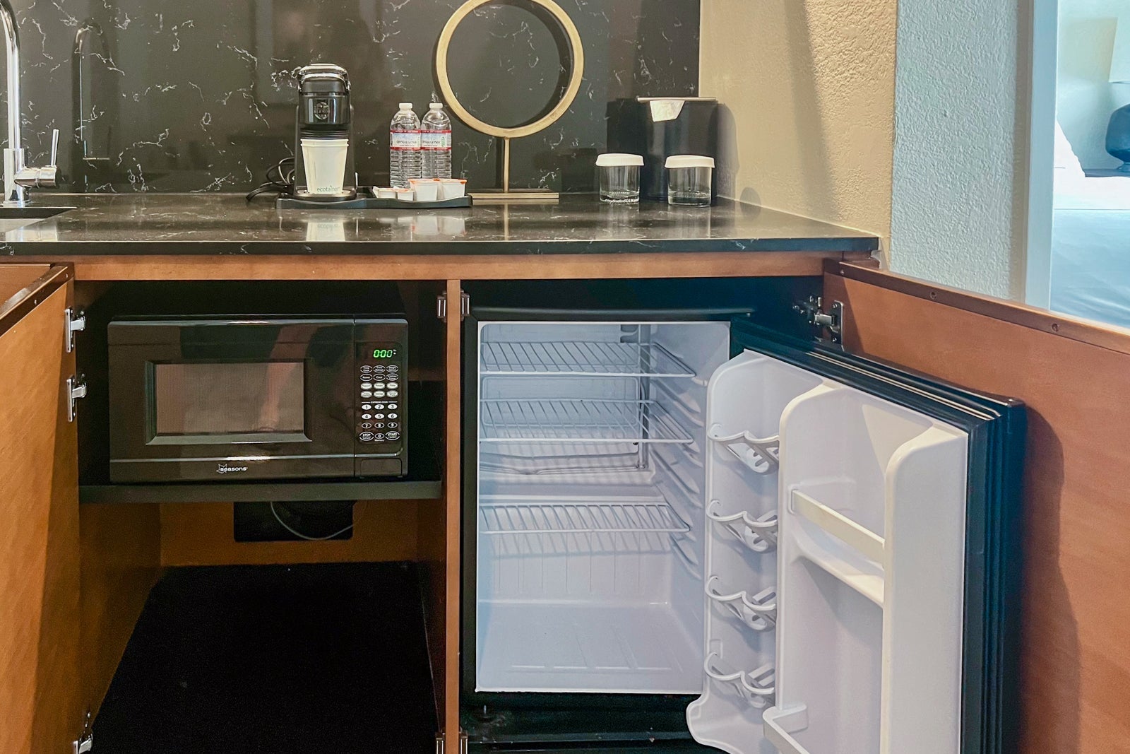 Back in the living room, across from the dining area, a kitchenette housed a minifridge, a microwave, a sink and a coffee machine stocked with a few pods and coffee accouterments.