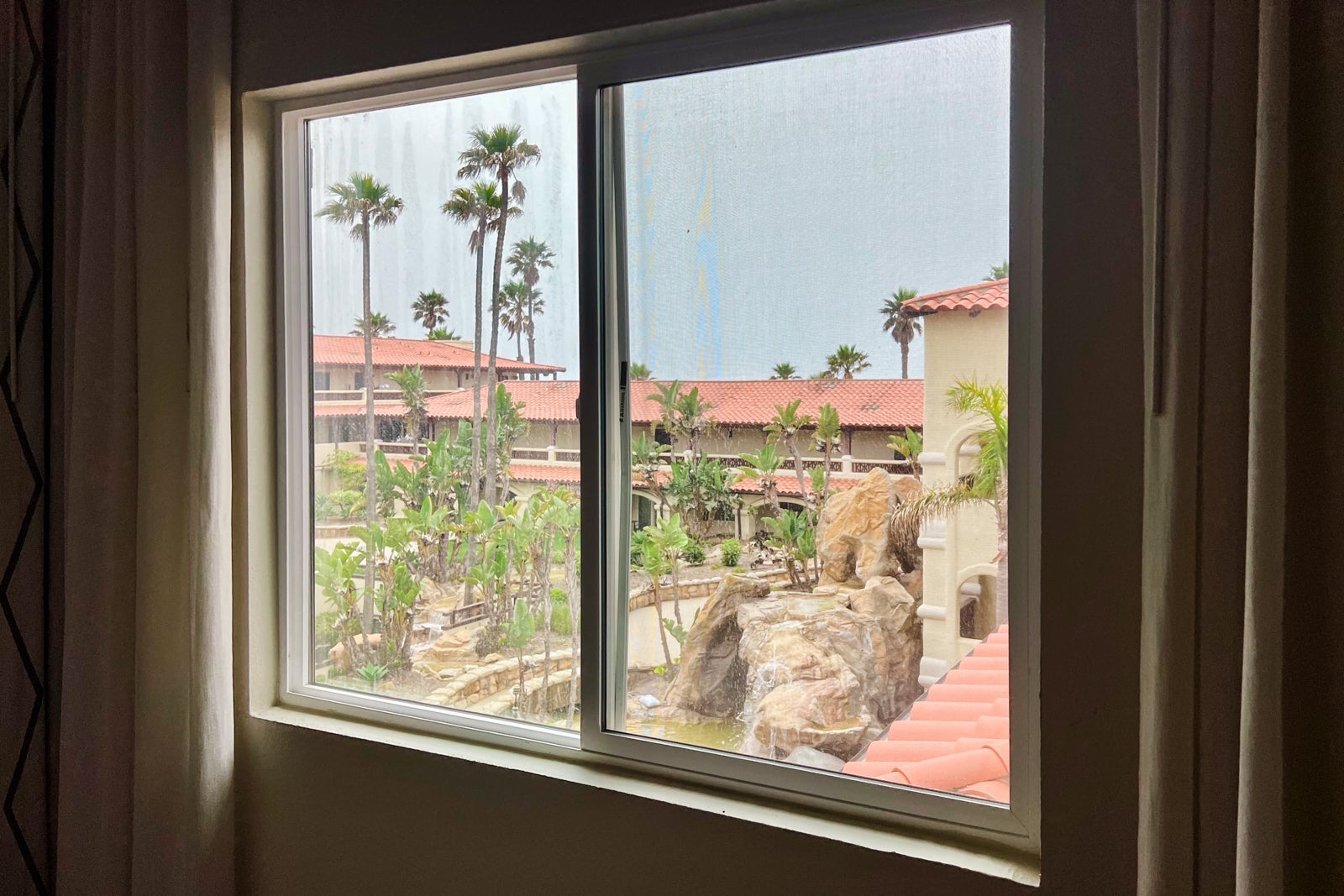 From the bedroom, I had a view of an inner courtyard of landscaped paths and waterfalls that spilled downward into the parking lot below. I thought it was a pretty area but since my window faced three floors of open corridors and a few room balconies, I kept my curtains drawn most of the time for privacy.
