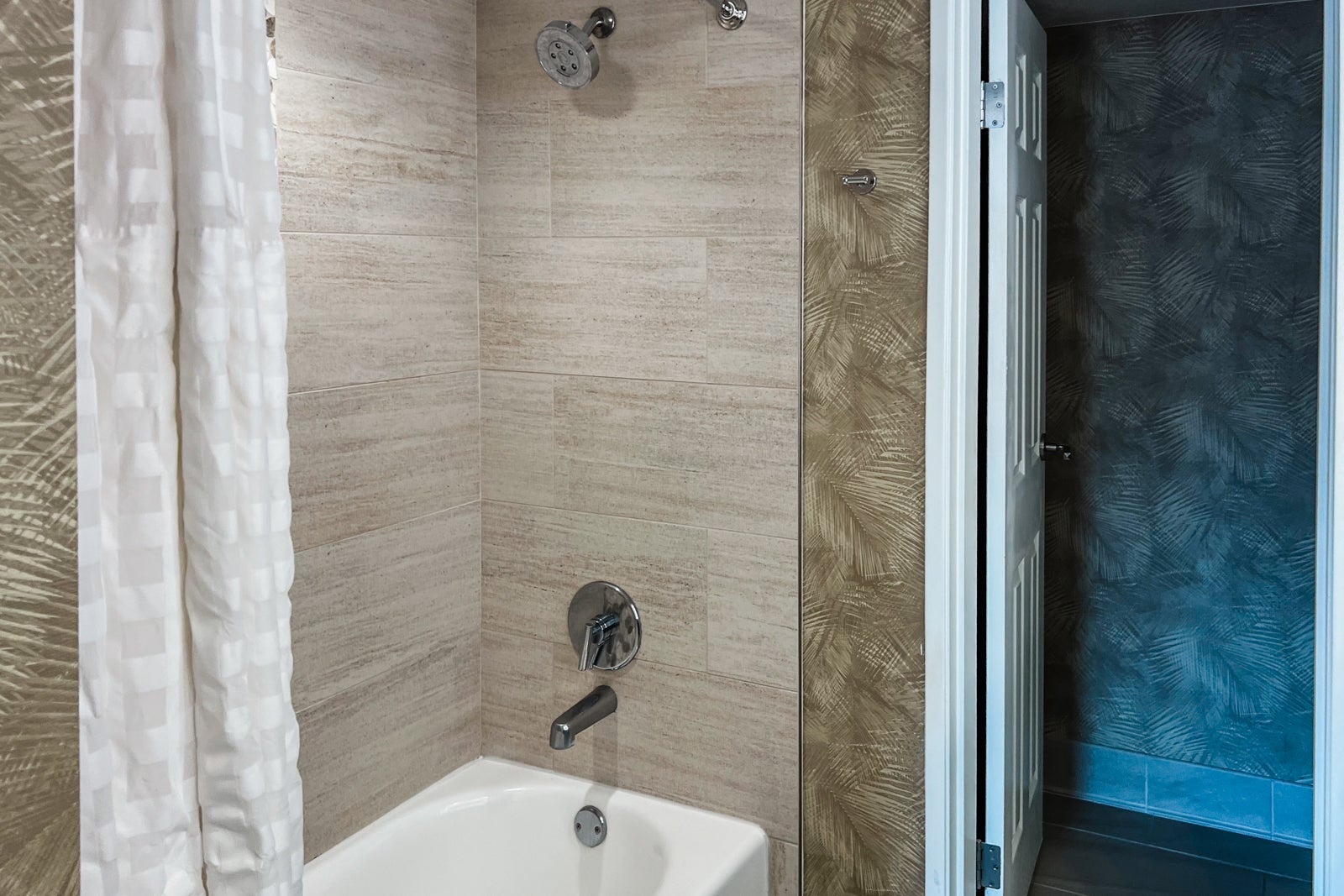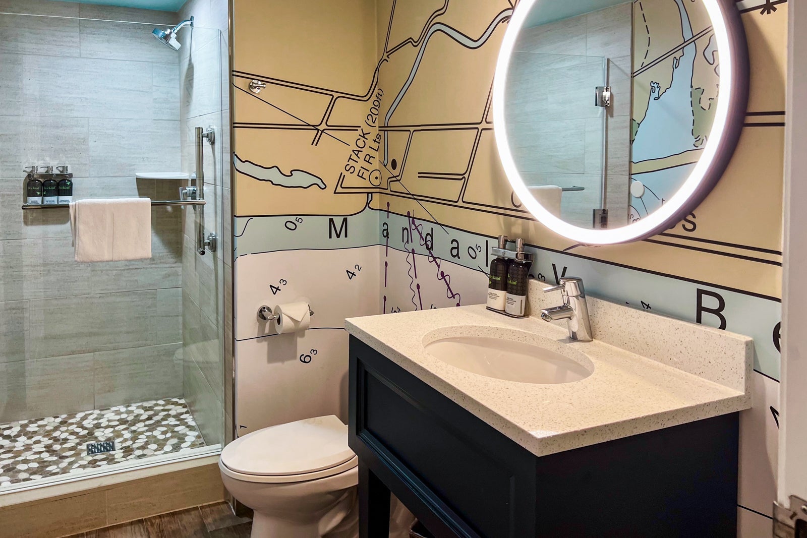 In this first bathroom, nautical-inspired wallpaper wrapped the room, and there was also a toilet, sink and walk-in tiled rainfall shower.