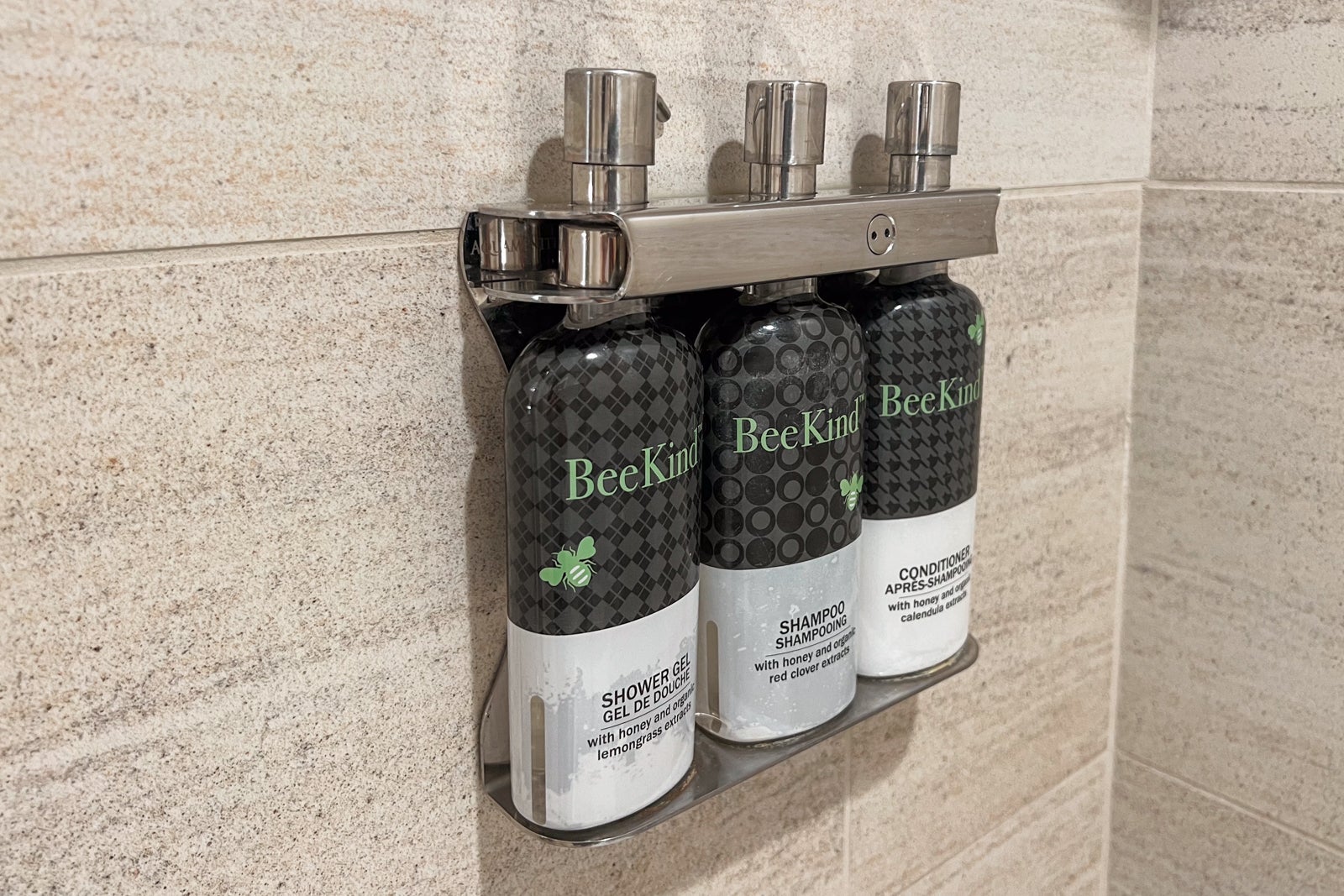 The bedroom also had an en-suite bathroom with a double-sink vanity, a shower and tub combo and a toilet separated by a door. The bathroom was so large, this was actually where we placed my baby's pack-and-play at night for her own separate sleep space. Both bathrooms came stocked with multiuse toiletries branded by BeeKind and plenty of fluffy white towels.