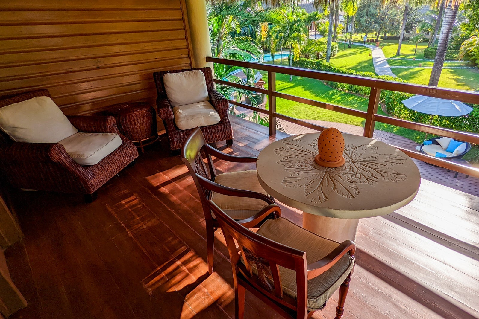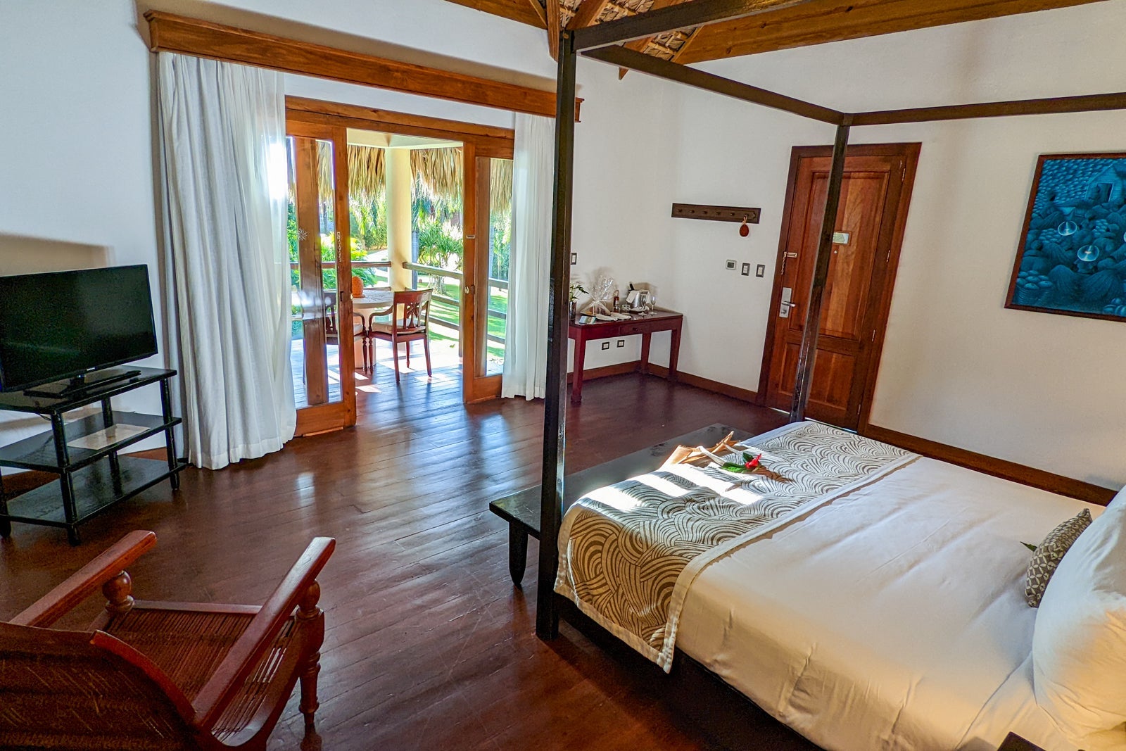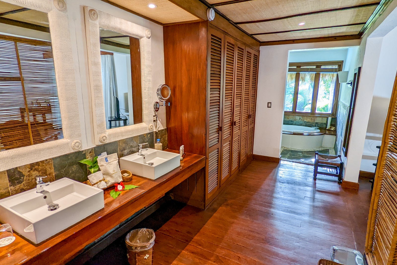 Our garden-view junior suite was located on the second floor, back from the beach, which ensured both a restful night's sleep on the four-poster bed and a lovely view of one of the many swimming pools from the suite's spacious deck. At 775 square feet, it was huge for a base room. I loved the vaulted, thatched ceilings and, while I'm not usually a fan of so much contrasting dark wood throughout, it gave a real sense of place in this tropical setting. A fruit plate, bottle of chilled prosecco and local rum were waiting for us when we arrived in the room. Unfortunately, the fridge stocked with some complimentary sodas and local beers took a good 24 hours to actually chill, but an ice bucket was only a quick call away to speed up the process.