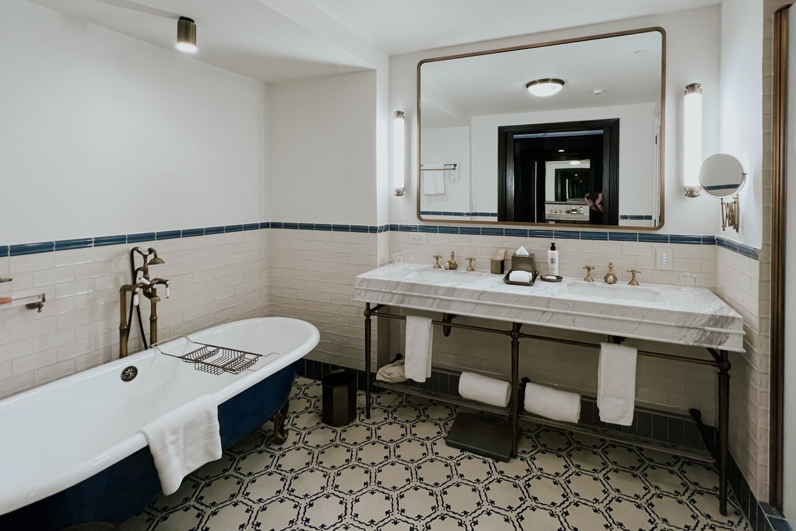 Opposite the closets was a large bathroom with a stand-alone, claw-footed soaking tub, double vanity and walk-in shower. The bronze and porcelain hardware throughout gave the room a more mature feel even though it was only a few weeks old. I'm not a huge fan of the open-concept bathrooms taking over the luxury hotel space these days, so I was happy to see the Sofitel Legend's spacious bathroom didn't include a bird's-eye view into the bedroom and beyond.